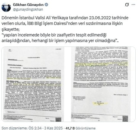 Günaydın paylaşımında, “Dönemin İstanbul Valisi Ali Yerlikaya tarafından 23 Haziran 2022 tarihinde verilen olurla, İBB Bilgi İşlem Dairesi’nden veri sızdırıldığı iddiasına ilişkin yapılan incelemede herhangi bir güvenlik zafiyetine rastlanmadığı belirtilmiş ve işlem yapılmamasına karar verilmiştir” ifadelerini kullandı.