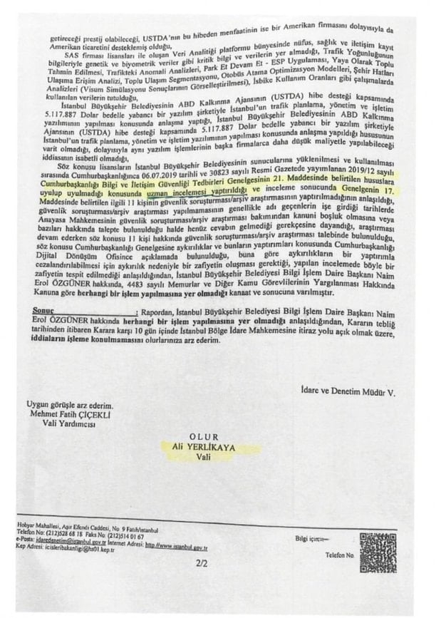 Söz konusu belgede, İBB Bilgi İşlem Daire Başkanı Erol Özgüner hakkında da herhangi bir idari işlem yapılmasına gerek olmadığı yönünde bir tespit yer alıyor.