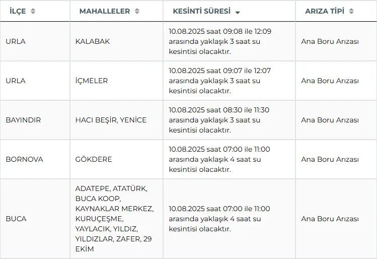 EGEPOSTASI- İzmir'de yaşanan su krizi nedeniyle ilçelerde planlı şekilde su kesintisi uygulanmaya devam ederken, İZSU bazı ilçelerin belirli bölgelerinde arıza ve onarım çalışmaları kapsamında planlı su kesintisi yapılacağını duyurdu.
