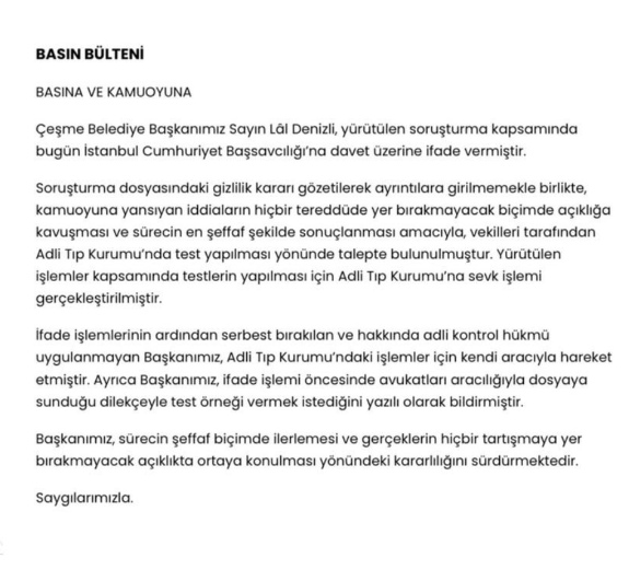 "Çeşme Belediye Başkanımız Sayın Lâl Denizli, yürütülen soruşturma kapsamında bugün İstanbul Cumhuriyet Başsavcılığı’na davet üzerine ifade vermiştir.