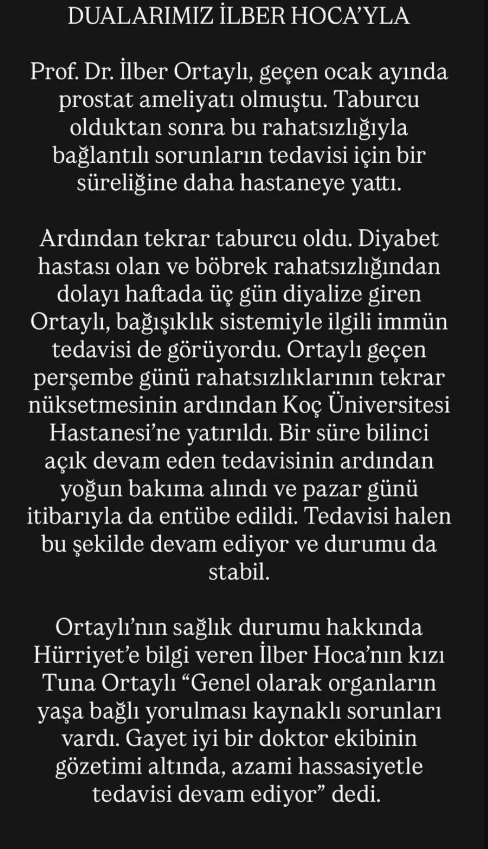 "Prof. Dr. İlber Ortaylı, geçen ocak ayında prostat ameliyatı olmuştu. Taburcu olduktan sonra bu rahatsızlığıyla bağlantılı sorunların tedavisi için bir süreliğine daha hastaneye yattı.