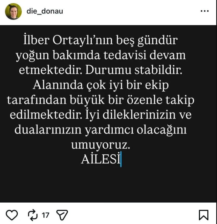 Ortaylı'nın ailesi tarafından yapılan açıklamada son durumunun ise stabil olduğu belirtildi.