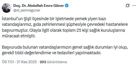 İstanbul İl Sağlık Müdürü Güner, sosyal medya hesabından konuya ilişkin yaptığı açıklamada, "İstanbul’un Şişli ilçesinde bir işletmede yemek yiyen bazı vatandaşlarımız, gıda zehirlenmesi şüphesiyle çevredeki hastanelere başvurmuştur. Olayla ilgili olarak toplam 25 kişi sağlık kuruluşlarına müracaat etmiştir. Başvuruda bulunan vatandaşlarımızın genel sağlık durumları iyi olup, gerekli tıbbi değerlendirme ve tedavileri yapılmaktadır." ifadelerine yer verdi.