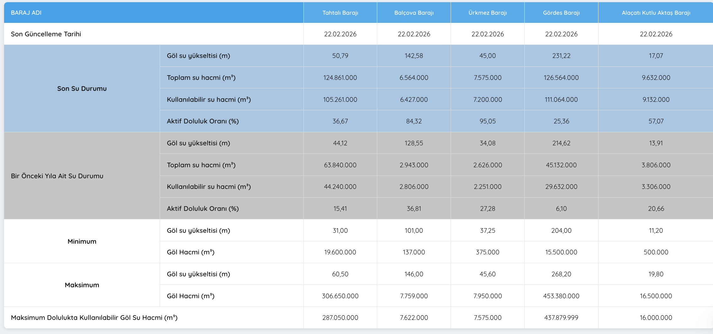 EGEPOSTASI- İzmir’in içme suyu ihtiyacını karşılayan barajlarda 22 Şubat 2026 tarihli son verilere göre doluluk oranları, geçen yılın aynı dönemine kıyasla önemli ölçüde yükseldi. Özellikle Tahtalı Barajı ve Gördes Barajı’ndaki artış dikkat çekti.