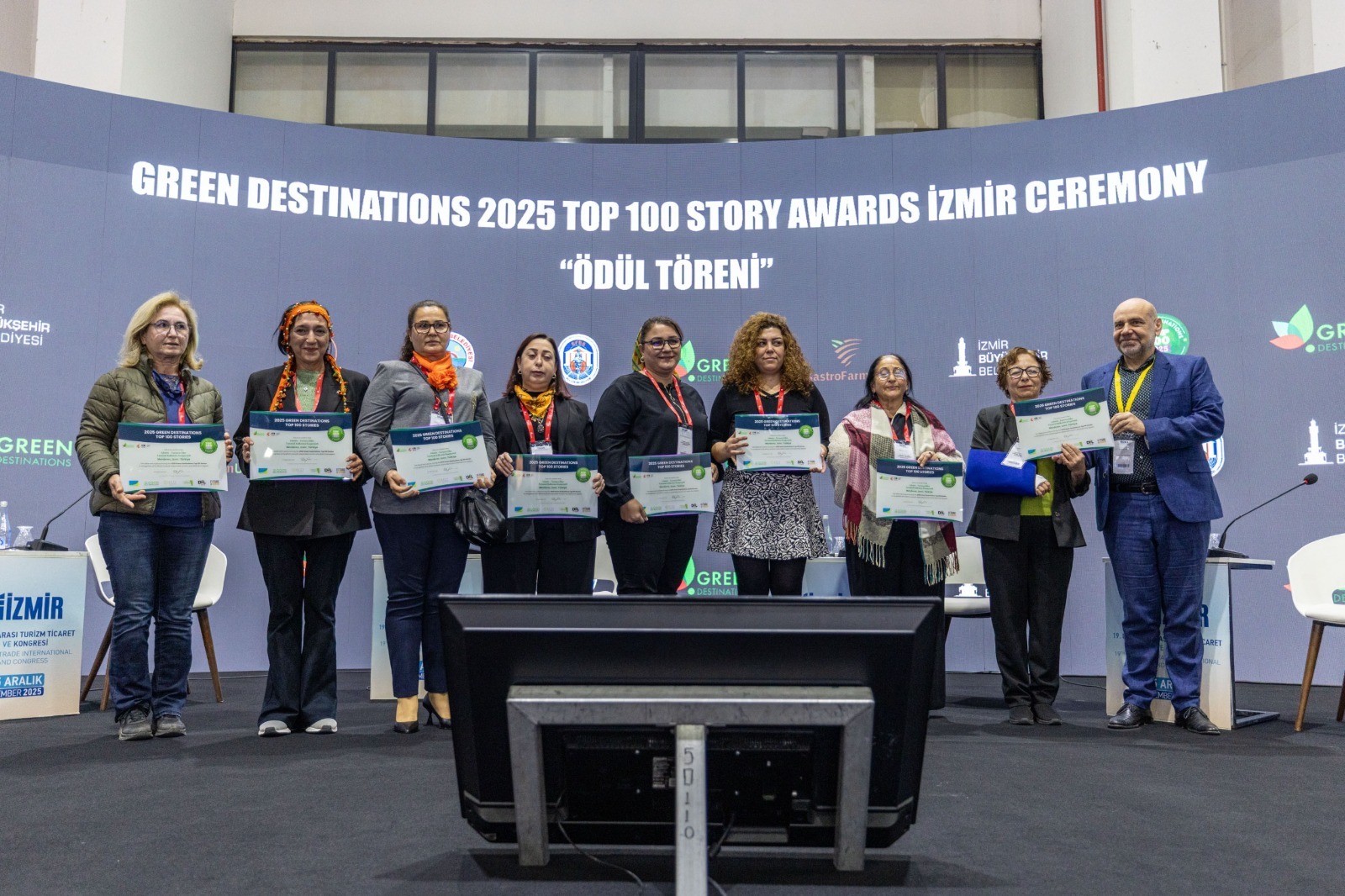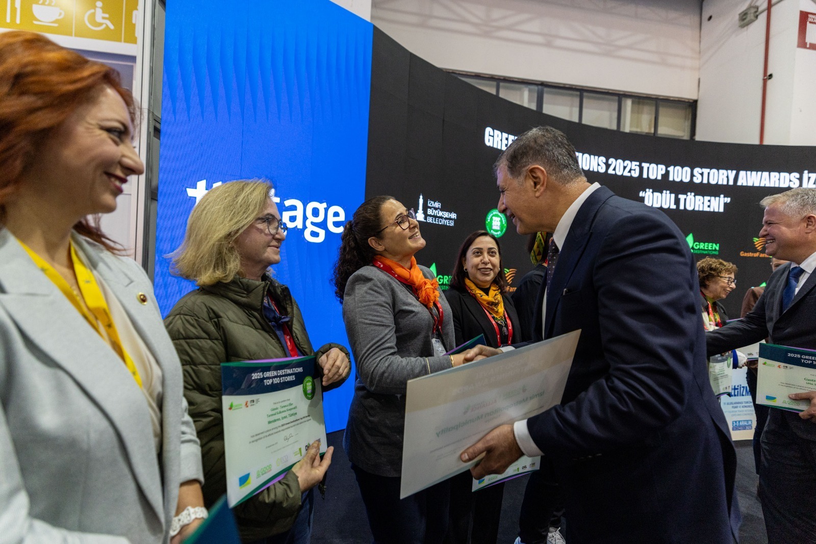 Konuşmasının devamında Tugay, “Bu ödül kentimizin, sürdürülebilir turizm konusunda dünyaya örnek oluşunun belgesidir. Turizm Şube Müdürlüğümüzdeki mesai arkadaşlarıma, büyük emekle yürüttüğü çalışmalar için teşekkür ediyorum. Bu başarıda, üreticilerin, kadın kooperatiflerinin, yerel girişimcilerin, turizm profesyonellerinin alın teri var. Hepsine teşekkür borçluyuz. El birliğiyle İzmir’i, sürdürülebilir yaşamın öncü destinasyonu haline getirdik. Bundan sonra da bu seviyede tutmak boynumuzun borcudur. Selçuk, Urla ve Menderes belediyeleri ve paydaşlarla yaptığımız çalışmalar sonucunda bu ilçelerimiz de ödül kazandı. “Green Destinations Top 100 Stories” yarışmasında üç destinasyon ile ödüle layık görüldüler.