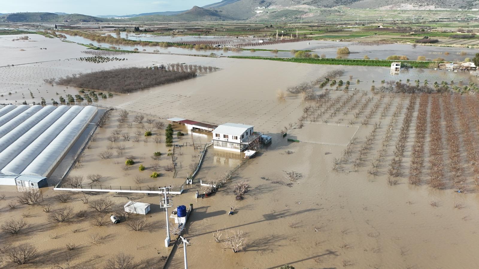 Bölgenin kot seviyesinin düşük olması ve yoğun yağışla birlikte Gediz Nehri’ni besleyen kolların debisinin yükselmesi sonucu çiftlik kısa sürede suyla doldu.