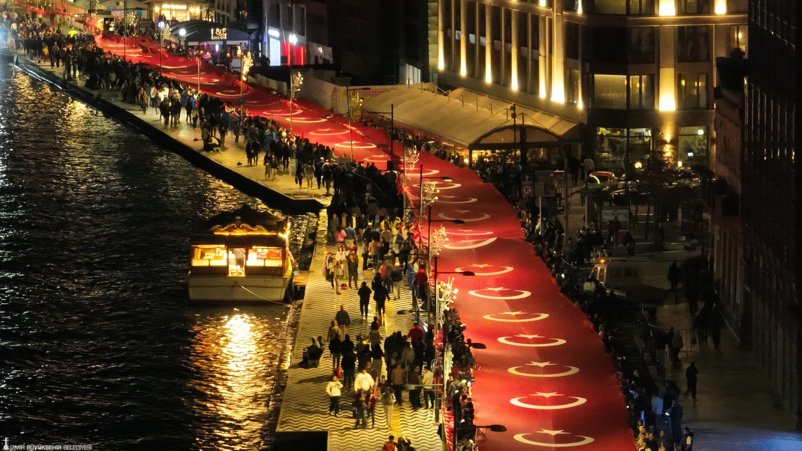 Kortej, Konak Pier önünde 350 metrelik Türk bayrağı ve fener alayı ile birleşti. Bandonun çaldığı marşlar eşliğinde kortej Cumhuriyet Meydanı'na doğru devam etti.
