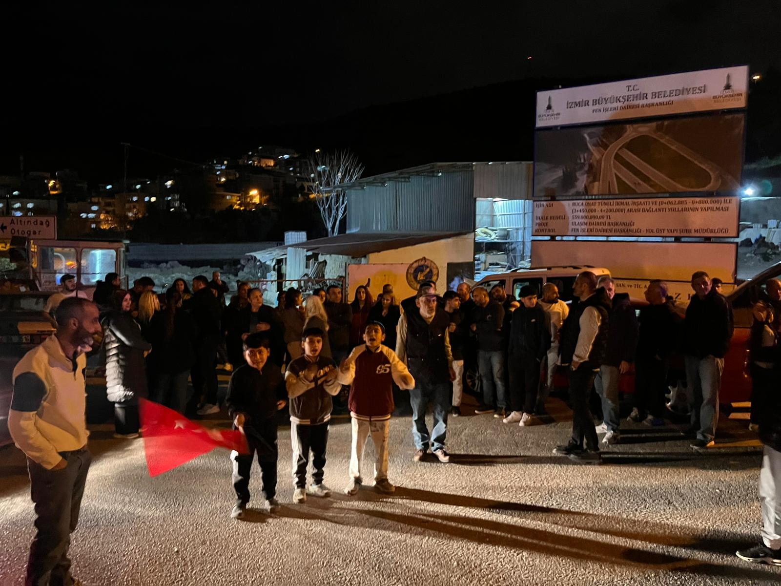 Diğer yandan akşam saatlerinde çalışmalardan etkilenen mahalle sakinleri, mağduriyetlerinin giderilmediği gerekçesiyle tepki gösterdi. Kalabalık bir grup, Buca ilçesinin Ufuk Mahallesi ile Bornova ilçesinin Çamkule Mahallesi arasında yer alan tünelin Çamkule şantiyesinde toplandı.