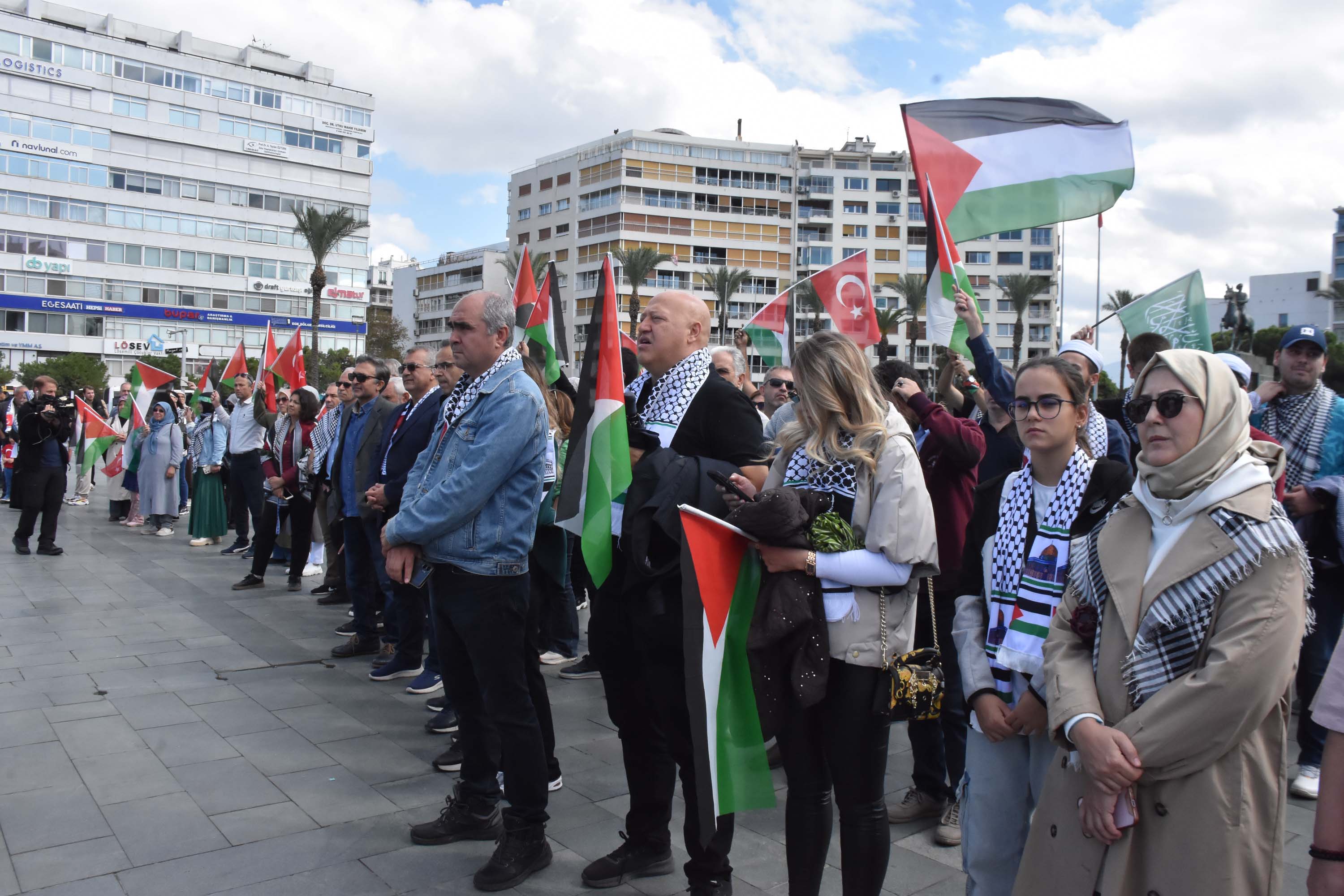 Etkinlikte Gazze ve Filistin'e destek mesajları verildi. Filistin'e Destek Platformu adına konuşan İzmir Sivil Toplum Kuruluşları (İSTOK) Dönem Başkanı Gökhan Temur, küresel Sumud Filosu'nun bir vicdan hareketi olduğunu dile getirdi. Gemilerde silah ve tehdit bulunmadığını söyleyen Temur, "O gemilerde mazlum çocukların sütü, annelerin ekmeği, babaların umudu, kardeşlerimizin vicdanı vardır. Zalim İsrail uluslararası hukuk ve insanlık değerlerini hiçe sayarak sivil inisiyatifi katletti. Bu saldırı yalnızca bir deniz haydutluğu değil insanlığın merhametine ve onuruna vurulmuş bir darbedir. Açlığa, kuşatmaya ve ölüme direnen bir halkın sesini susturmaya yönelik alçakça bir girişimdir. Hepimizin yüreğinde bir daha kapanmayacak derin bir yara açmıştır" dedi. Adaletin, insanlığın ve umudun rotasından hiçbir zaman sapmayacaklarını belirten Temur, Gazze kara sularına fiilen ulaşıldığını hatırlatıp, son gemide İsrail'in tutsağı durumunda 2'si İzmir'den 14 vatandaşın bulunduğunu ifade etti.