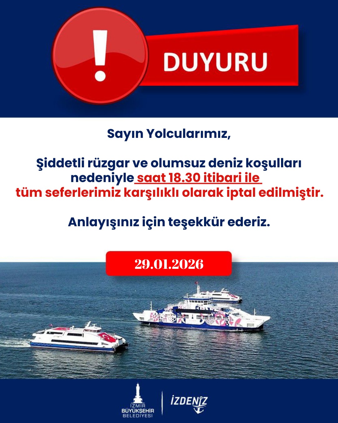EGEPOSTASI- İZDENİZ'den yapılan yazılı açıklamada, "Sayın yolcularımız, şiddetli rüzgar ve olumsuz deniz koşulları nedeniyle saat 18.30 itibari ile tüm seferlerimiz karşılıklı olarak iptal edilmiştir.