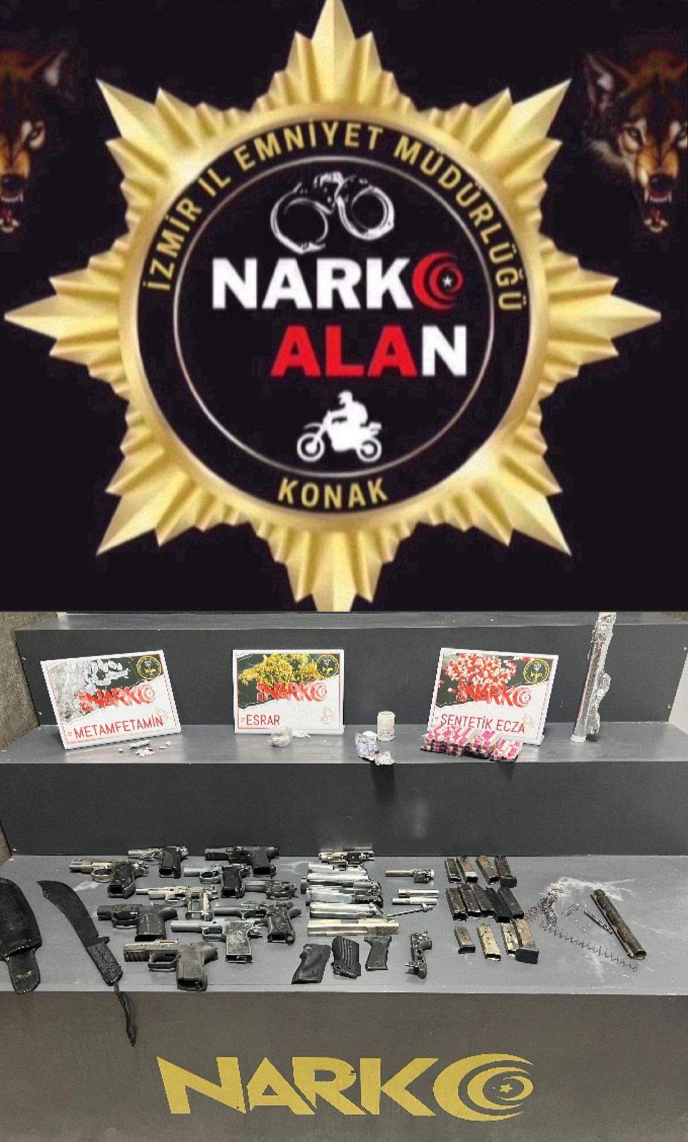 İzmir İl Emniyet Müdürlüğü’ne bağlı Narkotik Suçlarla Mücadele Şube Müdürlüğü ve Konak İlçe Emniyet Müdürlüğü ekiplerince oluşturulan Narkoalan timleri, 1-14 Ekim 2025 tarihleri arasında 11 farklı işyeri ve ev adreslerine operasyon düzenledi. Uyuşturucu ve silah ticaretine yönelik yapılan çalışmada, 103 gram bonzai, 14 gram kokain, 14 gram metamfetamin, 849 adet sentetik hap, 17,91 gram esrar, 3 hassas terazi, 15 bin 50 TL nakit para, 3 tabanca, 2 pompalı tüfek, 44 fişek ile çok sayıda silah parçası ele geçirildi.