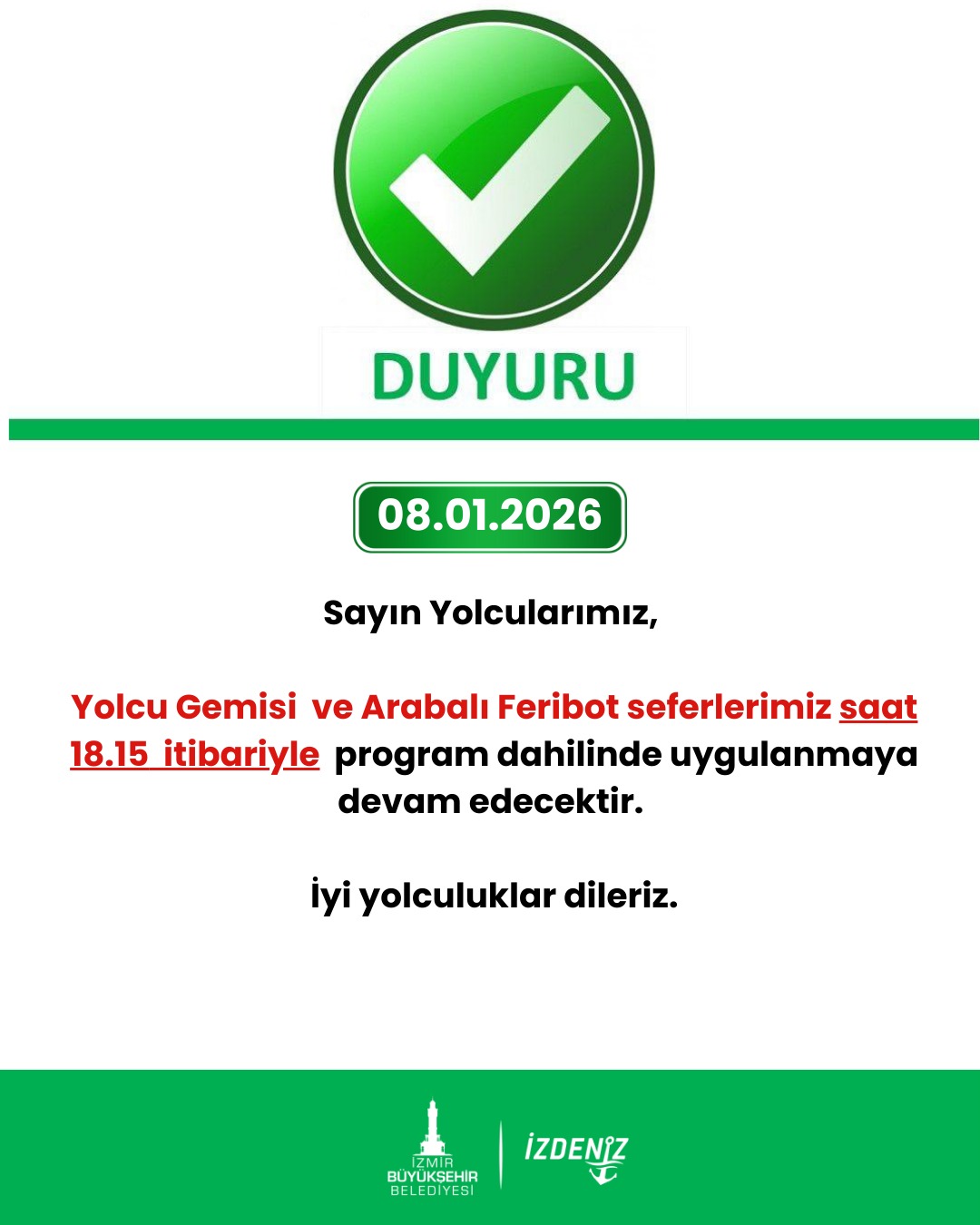 “Sayın Yolcularımız, İlimizi etkileyen olumsuz hava ve deniz koşullarının devam etmesi nedeni ile Yolcu Gemisi ve Arabalı Feribot seferlerimiz saat: 09.55 itibari ile iptal edilmiştir. Anlayışınız için teşekkür ederiz”