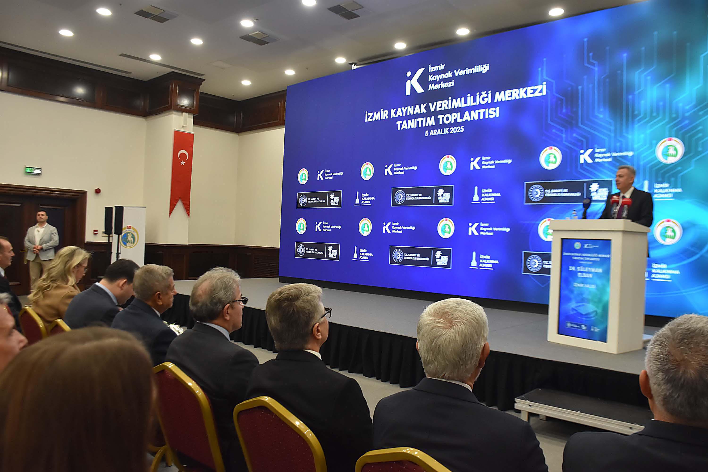 İzmir Kaynak Verimliliği Merkezi (İKVM) Tanıtım Toplantısı İzmir İktisat Kongresi binasında İzmir Valisi Süleyman Elban’ın katılımıyla yapıldı. Toplantıda Vali Elban'ın yanı sıra İzmir Kalkınma Ajansı Genel Sekreteri Mehmet Yavuz, bazı milletvekilleri ile oda, sivil toplum kuruluşu ve iş dünyasından temsilcileri yer aldı. İşletmelerin sürdürülebilir üretim ve yeşil dönüşüm hedeflerine ulaşmalarını desteklediklerini belirten Vali Süleyman Elban, "Kaynaklar gittikçe azalmaya, çevre sorunları oluşmaya başladı. İnsanlık bu çevre sorunları ile baş etmek kaynakları verimli kullanmak amacıyla çalışmaya başladı. Geri dönüşümün ön plana çıkartılarak üretimde ne kadar çok geri dönüşümden kazanılan malzemenin kullanıldığı önem kazanmaya başladı. Üretimde karbon salınımını azaltmak zorunluluk haline geldi. Eğer biz üretimde ne kadar çok dijital dönüşüm yaparsak o kadar verimli üretim ve daha az karbon salınımı ve enerji kullanmış oluruz. Hatalı üretim de bir israf ve kaynak tüketimidir. Hataları sıfırlamak daha az enerji için dijital dönüşüme geçmek zorundayız. Bunun yanı sıra zorlayıcı düzenlemeler ortaya çıktı. Avrupa Birliği müktesebatı 1 Ocak 2026’dan itibaren sınırda karbon ayak izi uygulamasına başlıyor. Bizim oraya ihraç ettiğimiz ürünlerin, daha çevreci ve teknolojik ürünler olduğunu ispatlamamız gerekiyor. Aksi taktirde ek ücret ödemek zorundayız. Bunu yapamazsak rekabet gücümüz azalır. Sınırda ödediğimiz tarifeler yüzünden maliyetlerimiz artar" dedi.