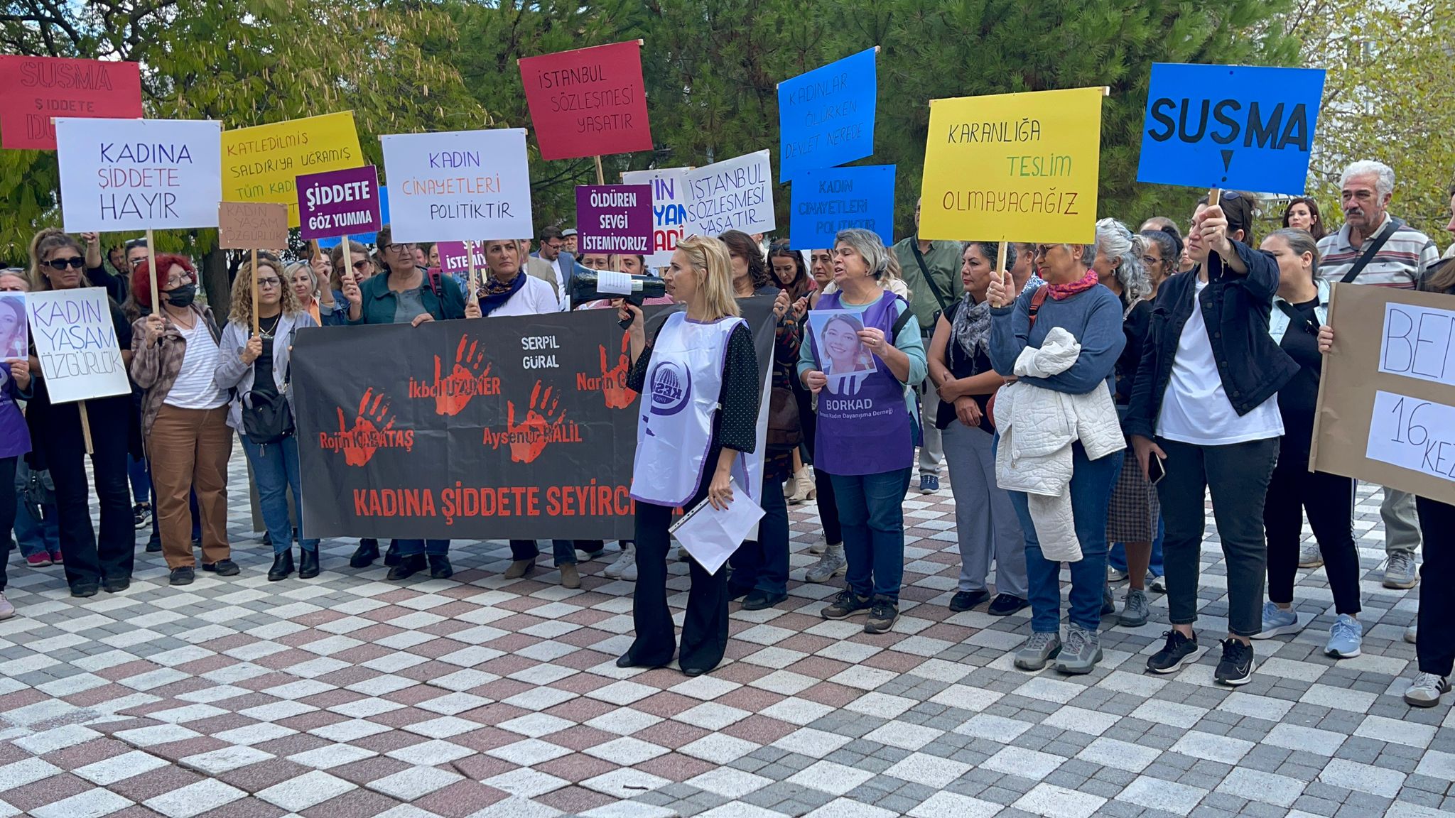 Ellerinde pankartlarla alanda "Susmuyoruz, korkmuyoruz, itaat etmiyoruz", "Kadın cinayetleri politiktir", "Onur için öldürmek onursuzluktur" sloganları atan kadınlar siyasilere ve yetkililere seslenerek "adalet" istedi.