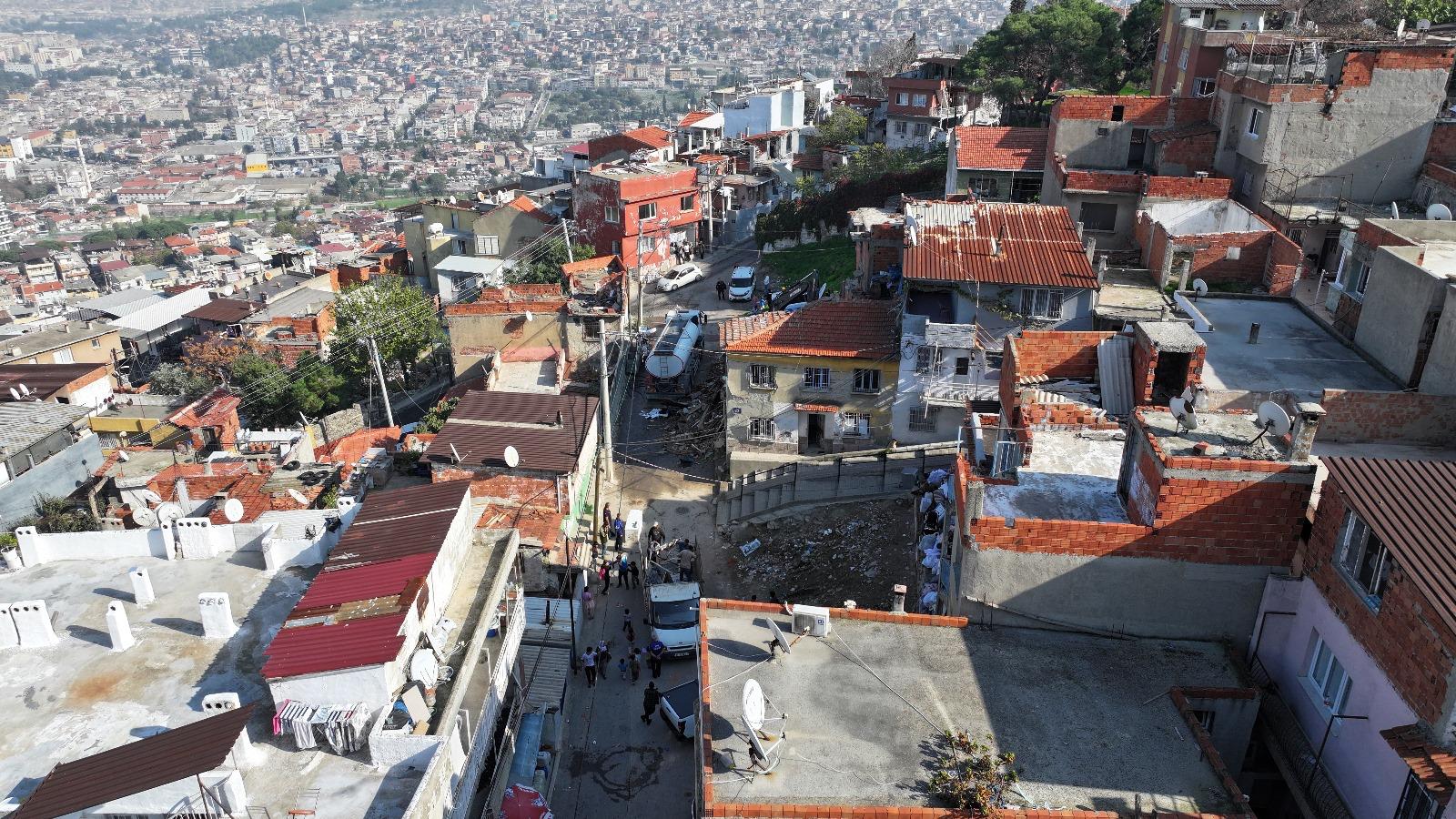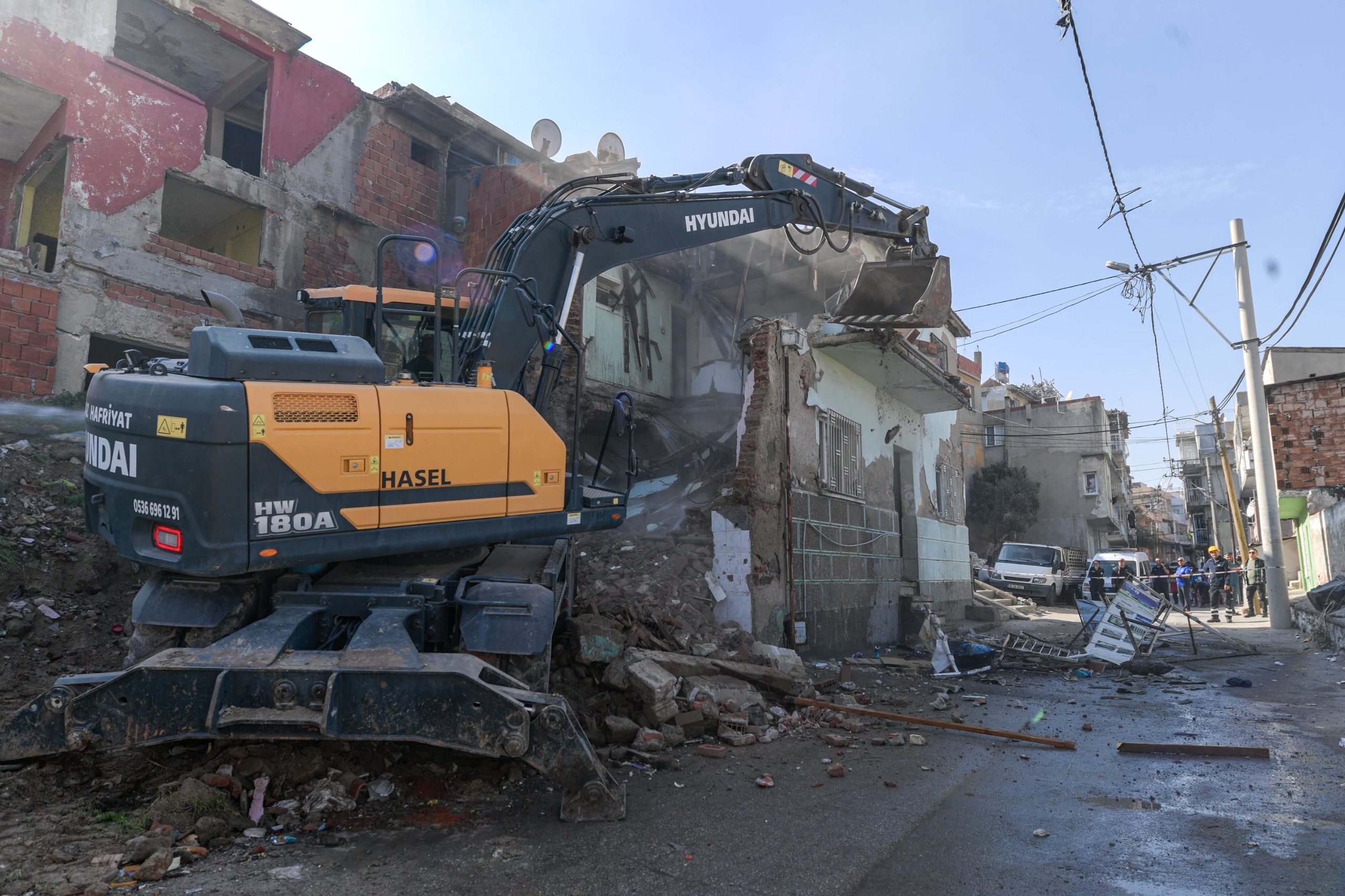 Tapuda İzmir Büyükşehir Belediyesi adına tescilli olan konutların yıkımı Büyükşehir Belediyesi ekipleri tarafından tüm güvenlik önlemleri alınarak yapılıyor.