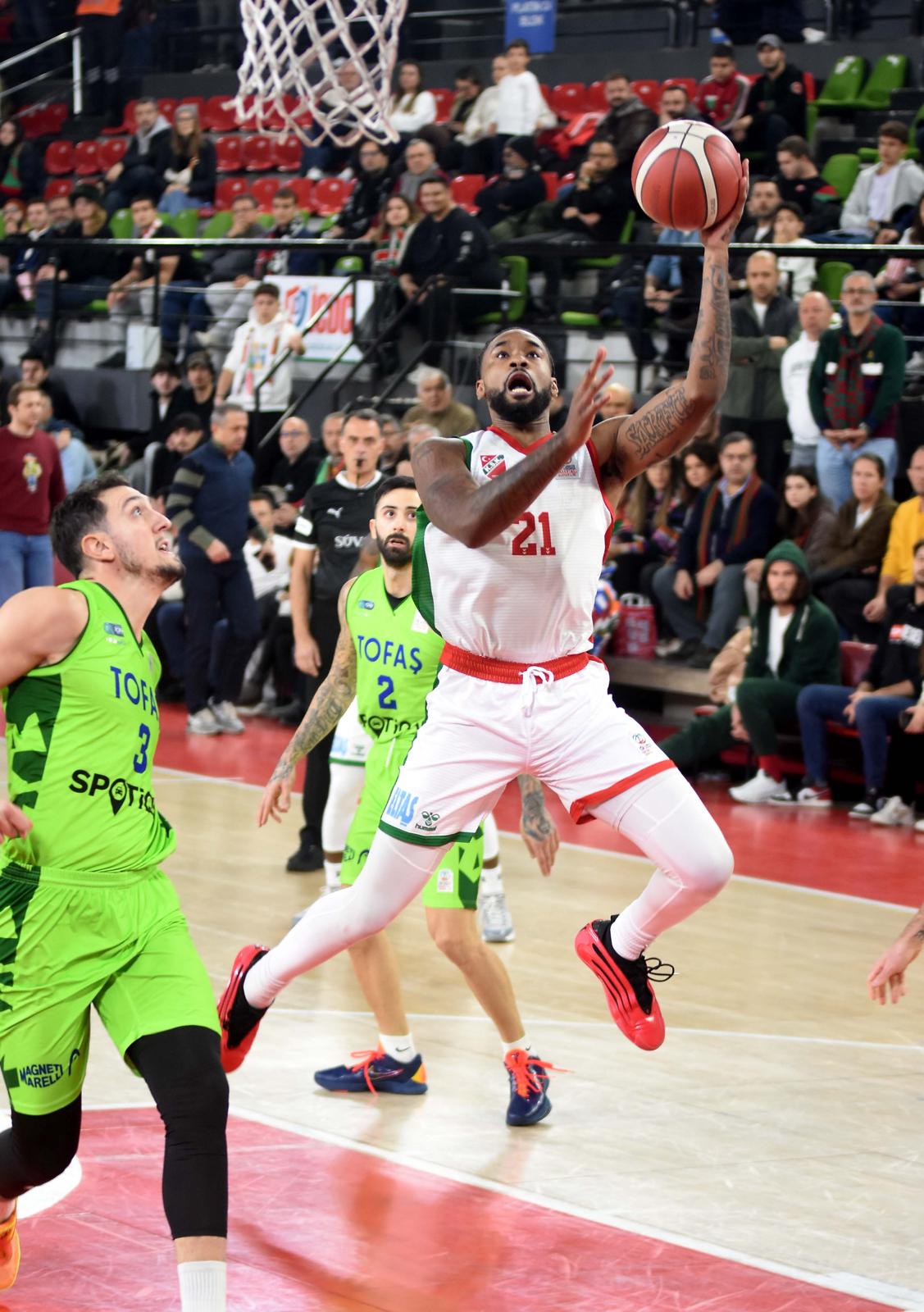 Basketbol Süper Ligi’nde düşme hattından kurtulmaya çalışan Karşıyaka evinde normal süresi 92-92 biten maçta Tofaş’ı 107-101 yenerek hayati bir galibiyet aldı. Mustafa Kemal Atatürk Karşıyaka Spor Salonu’nu dolduran taraftarının büyük desteğiyle kazanmayı başaran Kaf-Kaf 14 haftada 3 galibiyete ulaştı. Büyük sevinç yaşayan yeşil-kırmızılılarda Young 24, Alston 23, Bishop 22 sayı attı.