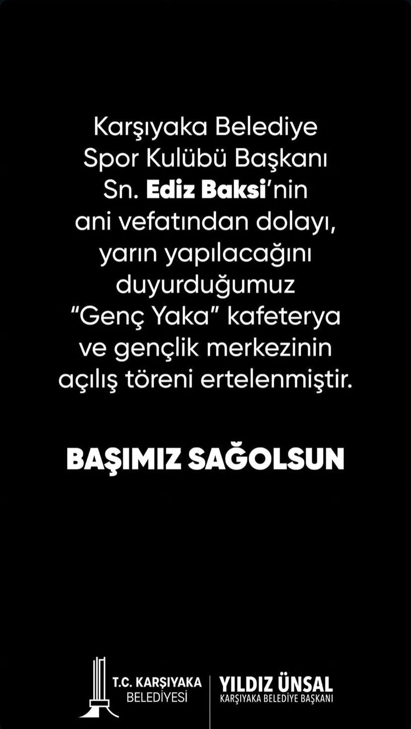 "Karşıyaka Belediye Spor Kulübü Başkanı Sn. Ediz Baksi’nin ani vefatından dolayı, yarın yapılacağını duyurduğumuz “Genç Yaka” kafeterya ve gençlik merkezinin açılış töreni ertelenmiştir.