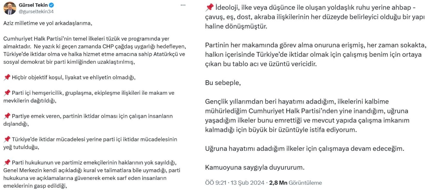 "Cumhuriyet Halk Partisi’nin temel ilkeleri tüzük ve programında yer almaktadır. Ne yazık ki geçen zamanda CHP çağdaş uygarlığı hedefleyen, Türkiye’de iktidar olma ve halka hizmet etme amacına sahip Atatürkçü ve sosyal demokrat bir parti kimliğinden uzaklaştırılmıştır" ifadeleriyle istifa ettiğini duyuran Gürsel Tekin 13 Şubat 2024'te yaptığı paylaşımda şu ifadelere yer vermişti: