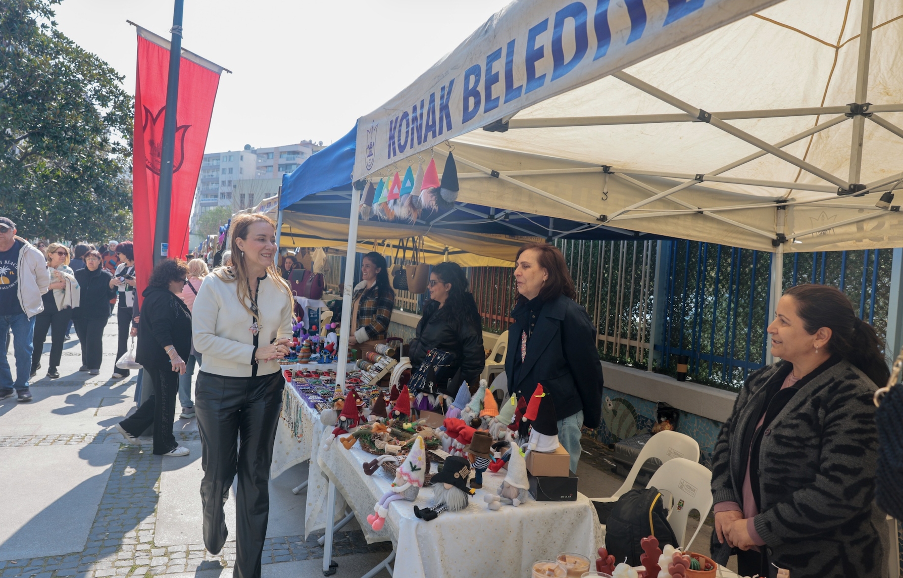 Etkinliğin başlangıcında sahneye çıkarak kadınları selamlayan Konak Belediye Başkanı Nilüfer Çınarlı Mutlu, “Sevgili komşularım, değerli kız kardeşlerim... Bugün burada emeğini bizlerle paylaşan, emeğini bizlerin beğenisine sunan kadın arkadaşlarımızın stantlarının önünde bir aradayız. Hem eğleneceğiniz hem de kadın emeğinin görünür olacağı bir etkinlik planladık. Hepinize geldiğiniz için çok teşekkür ediyorum. Kadınlara ekonomik alan açan bu kermeslere sahip çıkmak çok kıymetli. 8 Mart Dünya Kadınlar Günümüz kutlu olsun. İçimizdeki ışık hiç sönmesin, her bir kadın kendi ışığıyla dünyayı aydınlatmaya devam etsin” ifadelerini kullandı.