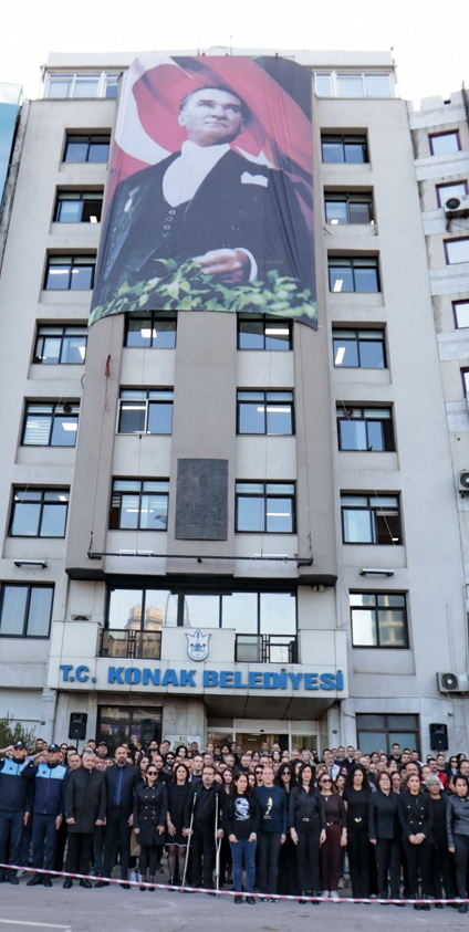 Konak Belediyesi personeli, Ulu Önder Mustafa Kemal Atatürk’ün sonsuzluğa uğurlanışının 87’nci yıl dönümünde, saat 9’u 5 geçe, belediye hizmet binası önünde saygı duruşu gerçekleştirdi. Başta Basmane’deki ana hizmet binası olmak üzere, kentin farklı noktalarındaki hizmet birimleri, Ulu Önder’i anmak için bina önlerinde bir araya geldi. Basmane hizmet binasına asılan dev Atatürk posteri altında toplanan belediye çalışanları, saat tam 9’u 5 geçe, Atatürk için saygı duruşunda bulundu.