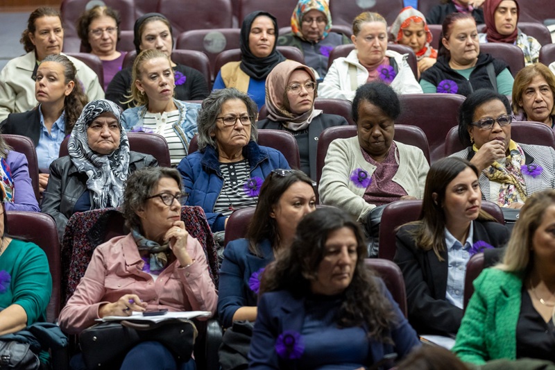 Panelin açılış konuşmasını gerçekleştiren Başkan Nilüfer Çınarlı Mutlu, sadece bu yılın başından itibaren 411 kadının öldürülerek hayattan koparıldığına vurgu yaptı. Bunun bir cinskırımı olduğuna dikkat çeken Başkan Mutlu, bu vahşete sessiz kalmamak amacıyla bir araya geldiklerini dile getirdi. Kadına yönelik şiddetle mücadelede hep birlikte olup mücadeleyi büyütmek gerektiğine değinen Başkan Mutlu, bu amaçla Kadın Danışma ve Dayanışma Merkezlerini hayata geçirdiklerini söyledi ve konuşmasını şöyle sürdürdü: “Kadınların sesini büyütmek, gücünü artırmak zorundayız. Kadınların, şiddet karşısında çalabileceği bir kapıları olsun istedik ve Kadın Danışma ve Dayanışma Merkezlerimizi hayata geçirdik. Psikolojik ve hukuki destek birimlerimiz var. Burada, şiddete uğrayan kadınlar için oluşturduğumuz başvuru ve yönlendirme mekanizmalarımız var. Toplumsal cinsiyet eşitliği eğitimlerimiz ve mahalle düzeyinde yürüttüğümüz bilgilendirme çalışmalarımız var. Farklı mahallelerimizde hizmet veren Mutlu Çocuklar Oyun Evlerimiz ile kadınların üzerindeki yükü bir nebze de olsa almaya çalışıyoruz. Hayata geçirdiğimiz meslek edindirme kurslarıyla kadınlara ekonomik özgürlük alanı açıyoruz. Kadın emeğini, düzenlediğimiz kermeslerle görünür kılıyor, bu değerin karşılık bulmasını sağlıyoruz. Konak’ta hiçbir kadının kendini yalnız hissetmediği, hiçbir çocuğun şiddetin gölgesinde büyümediği, eşitlikten ve adaletten yana bir kent inşa etmek için çalışıyoruz.”