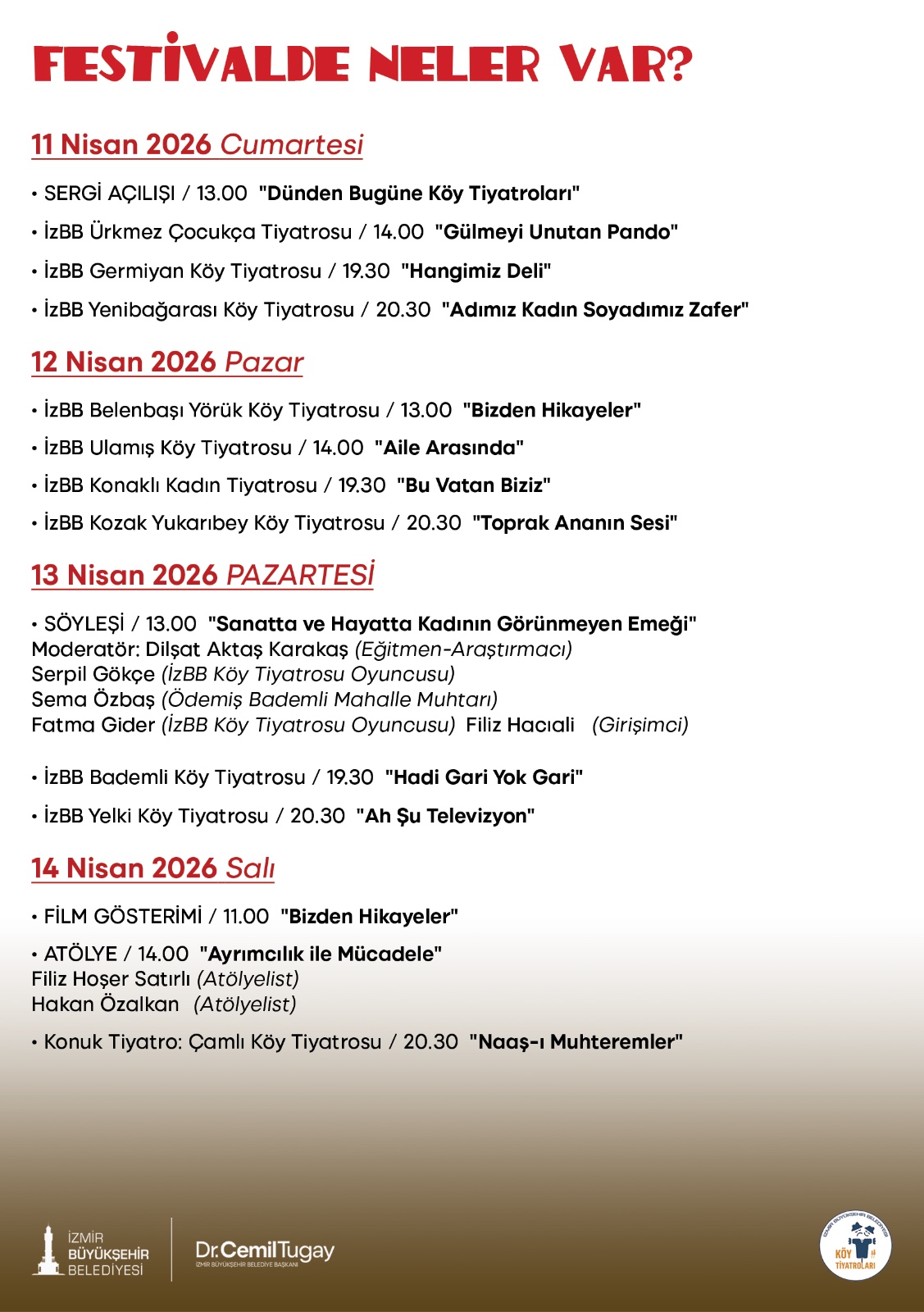 13 Nisan Pazartesi saat 13.00’te “Sanatta ve Hayatta Kadının Görünmeyen Emeği” başlıklı söyleşi gerçekleştirilecek, ardından saat 19.30’da Dikili Bademli Köy Tiyatrosu “Hadi Gari Yok Gari”, saat 20.30’da ise Yelki Köy Tiyatrosu “Ah Şu Televizyon” adlı oyunlarını sahneleyecek. Festivalin son günü olan 14 Nisan Salı saat 11.00’de “Köy Tiyatrosu Her Yerde” adlı film gösterimi yapılacak. Saat 14.00’te “Ayrımcılık ile Mücadele” atölyesi düzenlenecek ve festival saat 20.30’da Güzelbahçe Belediyesi Çamlı Köy Tiyatrosu’nun “Naaş-ı Muhteremler” adlı oyunu ile sona erecek.