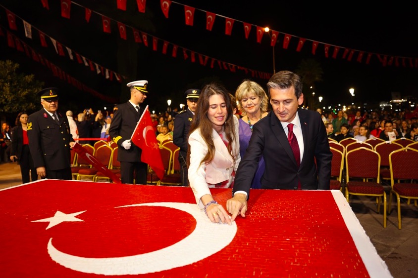 Akşam saatlerinde, binlerce vatandaş meşaleleriyle Uğur Mumcu Parkı’ndan Cumhuriyet Meydanı’na yürüdü. Fener Alayı sırasında marşlar ve sloganlar eşliğinde Çeşme sokaklarını aydınlatan kalabalık, Cumhuriyet coşkusunu hep birlikte yaşadı. Meydanda düzenlenen törende, Çeşme Belediye Başkanı Lâl Denizli ve Kaymakam Mehmet Maraşlı, günlerdir vatandaşların katılımıyla yapımı süren mozaikten Türk bayrağının son parçalarını birlikte yerleştirdi.