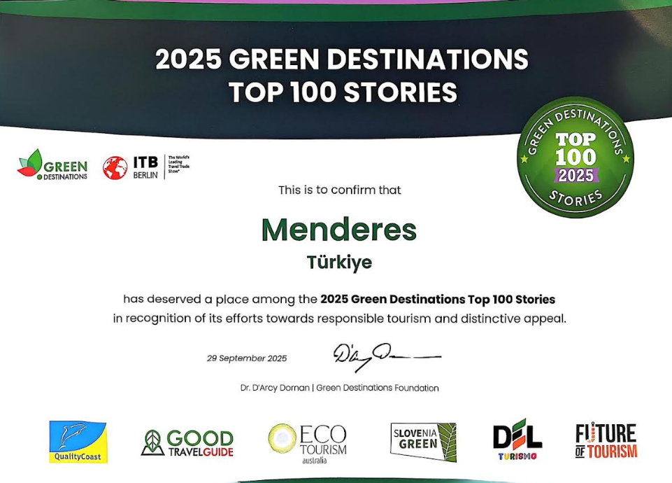 Menderes ‘Green Destinations Top 100 Stories’ yarışmasında büyük gurur yaşadı. Uluslararası bir kuruluş olan Green Destinations’un prestijli listesine giren Güm-Öz Turuncu Eller Tarımsal Kalkınma Kooperatifi Fransa’da düzenlenen törende ödülünü aldı. Menderes’i temsilen törene, İzmir Büyükşehir Belediyesi Turizm ve Fuarcılık Komisyonu Başkanı, İzmir Büyükşehir Belediyesi ve Menderes Belediyesi Meclis Üyesi Seyhan Müşerref Kuralı katıldı.