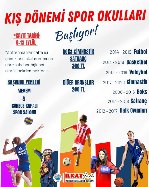 Menderes Belediyesi’nin kış dönemi spor okulları yakında başlıyor. Çocuklarını kaydetmek isteyen vatandaşlar için kayıtlar 13 Eylül’de sona eriyor. Kayıt için kimlik ile gelinmesi yeterli olacak. Vatandaşlar tek sefere mahsus 800 TL forma bedelinin yanı sıra eğitim boyunca branşa göre değişen 200-300 TL arası aidat ödeyecek.İşlemler Menderes Belediyesi Gençlik ve Eğitim Merkezi (MEGEM) ile Görece Kapalı Spor Salonu’nda yapılabilecek.