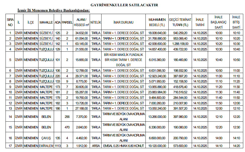Söz konusu taşınmazların ihaleleri Menemen Belediyesi Meclis Salonu’nda 14 Ekim 2025 Salı ve 15 Ekim 2025 Çarşamba günleri saat 10.00 itibariyle gerçekleştirilecek.