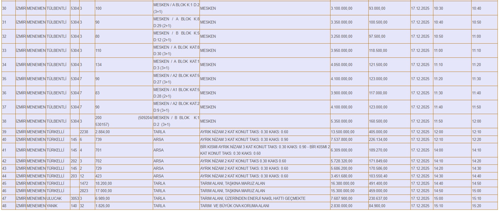 Menemen’in Ahıhıdır Mahallesi’nde 2, Ayvacık Mahallesi’nde 1, Belen Mahallesi’nde 8, Çavuş Mahallesi’nde 3, Emiralem Mahallesi’nde 1, Kasımpaşa Mahallesi’nde 1, Koyundere Mahallesi’nde 1, Maltepe Mahallesi’nde 5, Musabey Mahallesi’ de 2, Seyrek Mahallesi’nde 2, Tülbentli Mahallesi’nde 12, Türkelli Mahallesi’nde 8 ve Ulucak ile Yanık Mahallelerinde 1’er taşınmaz satışa çıkarıldı.