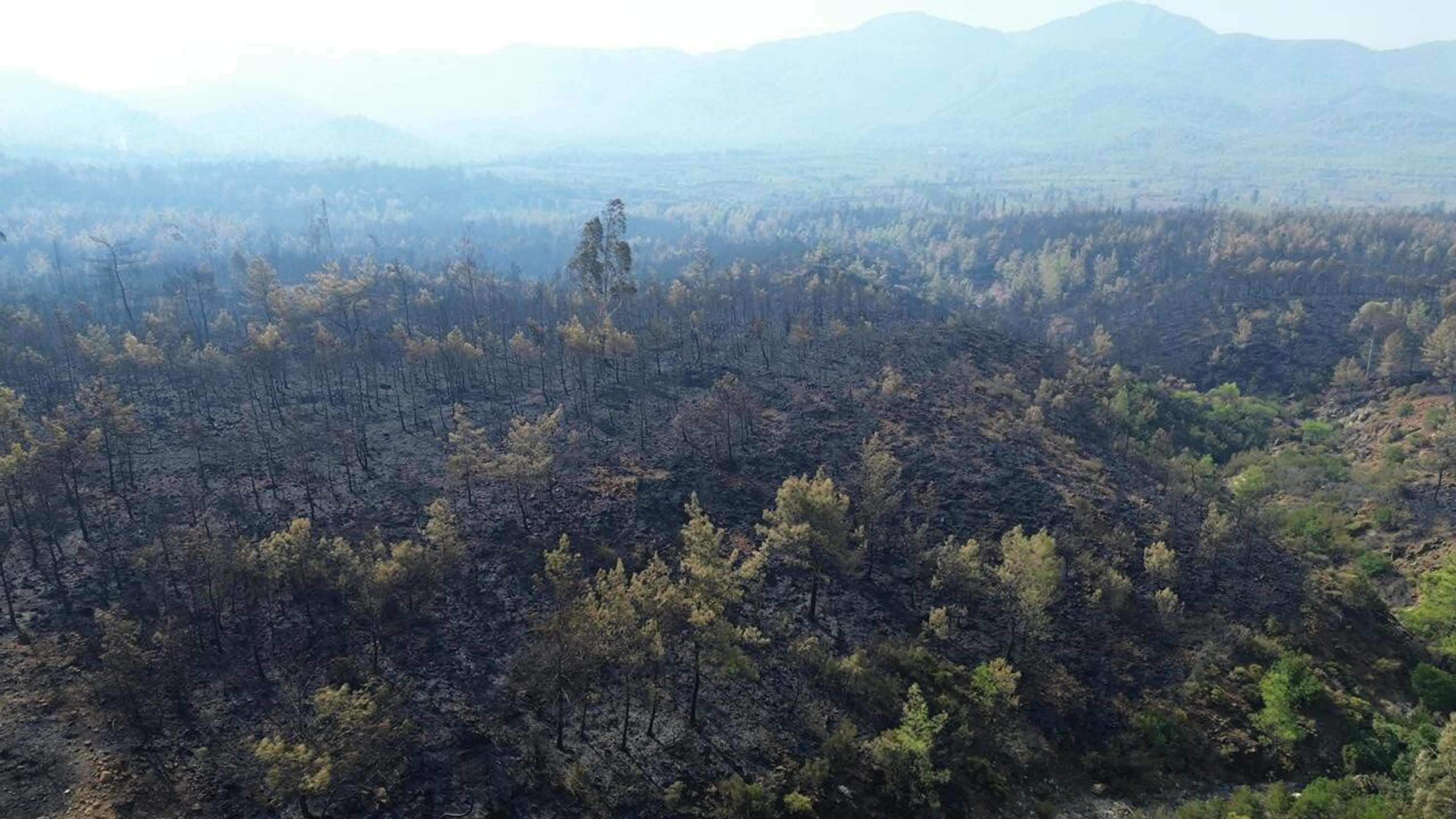 Görüntülerde, geniş bir alanın küle döndüğü, bazı bölgelerden ise dumanların yükselmeye devam ettiği görüldü.