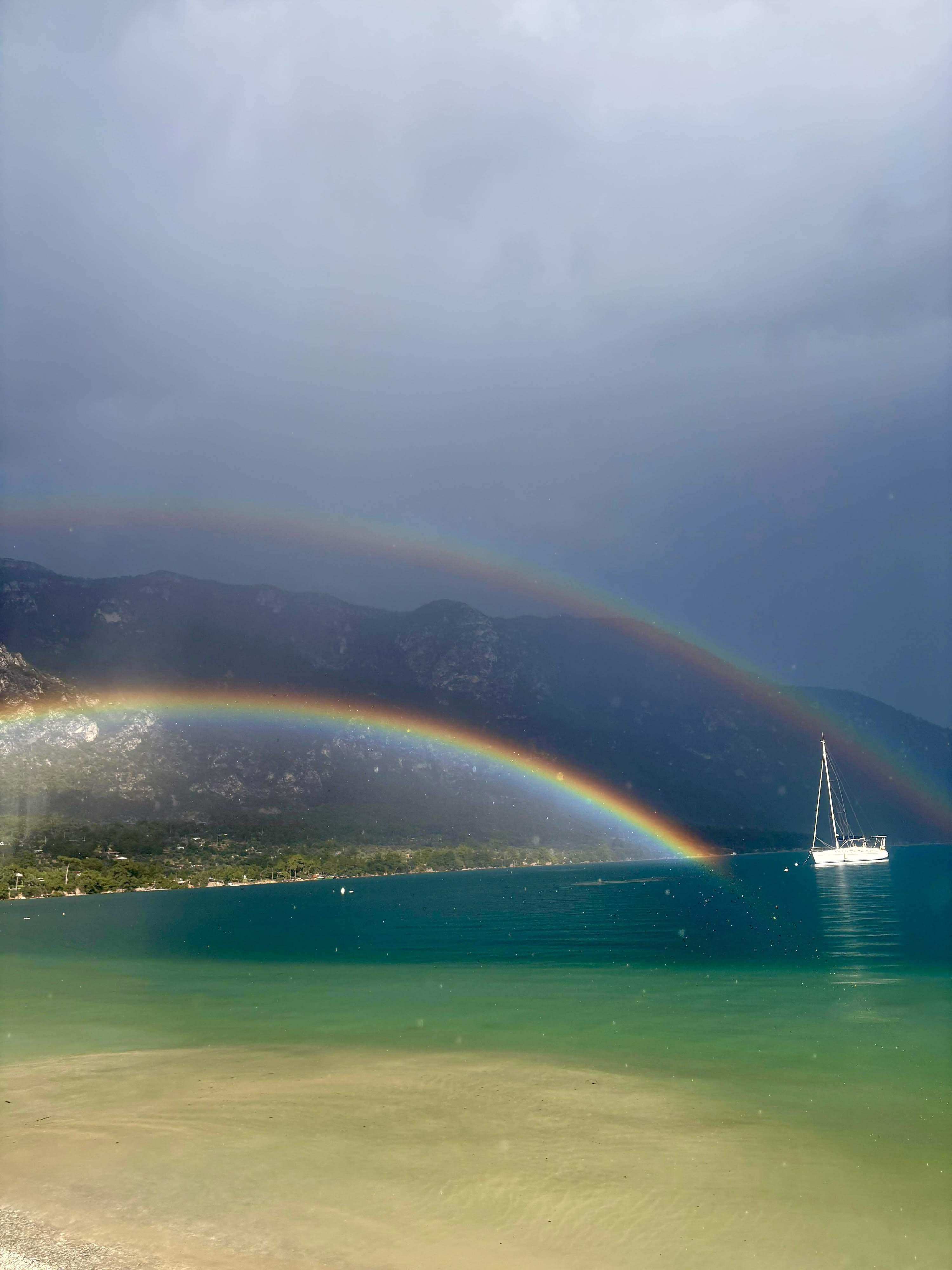 Menteşe ilçesinde dün sabah saatlerinden itibaren sağanak, etkili oldu. Akbük Sahili'nde yağmur bulutlarının bir anda dağılıp güneşin yüzünü göstermesiyle, çift gökkuşağı ortaya çıktı.