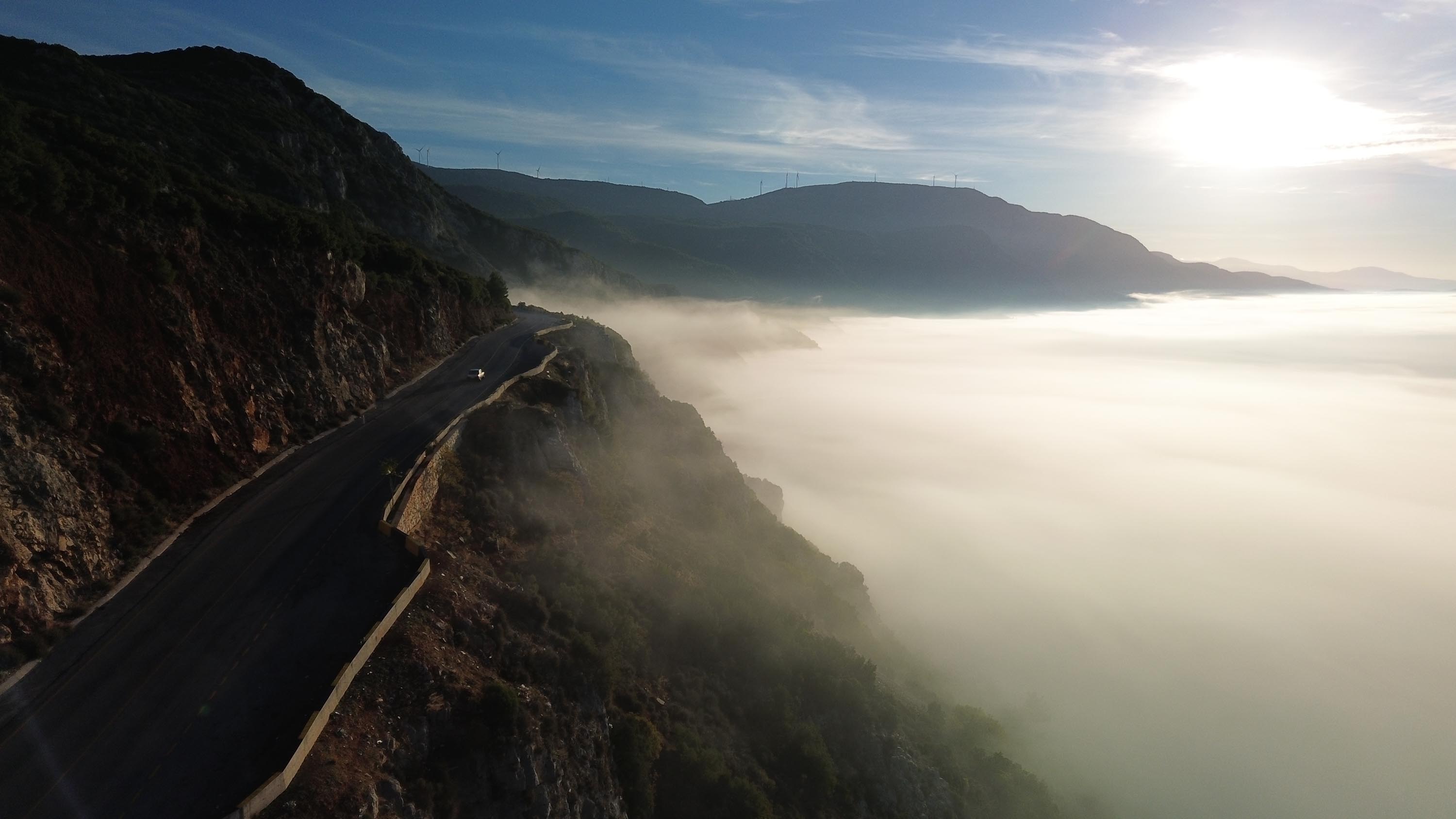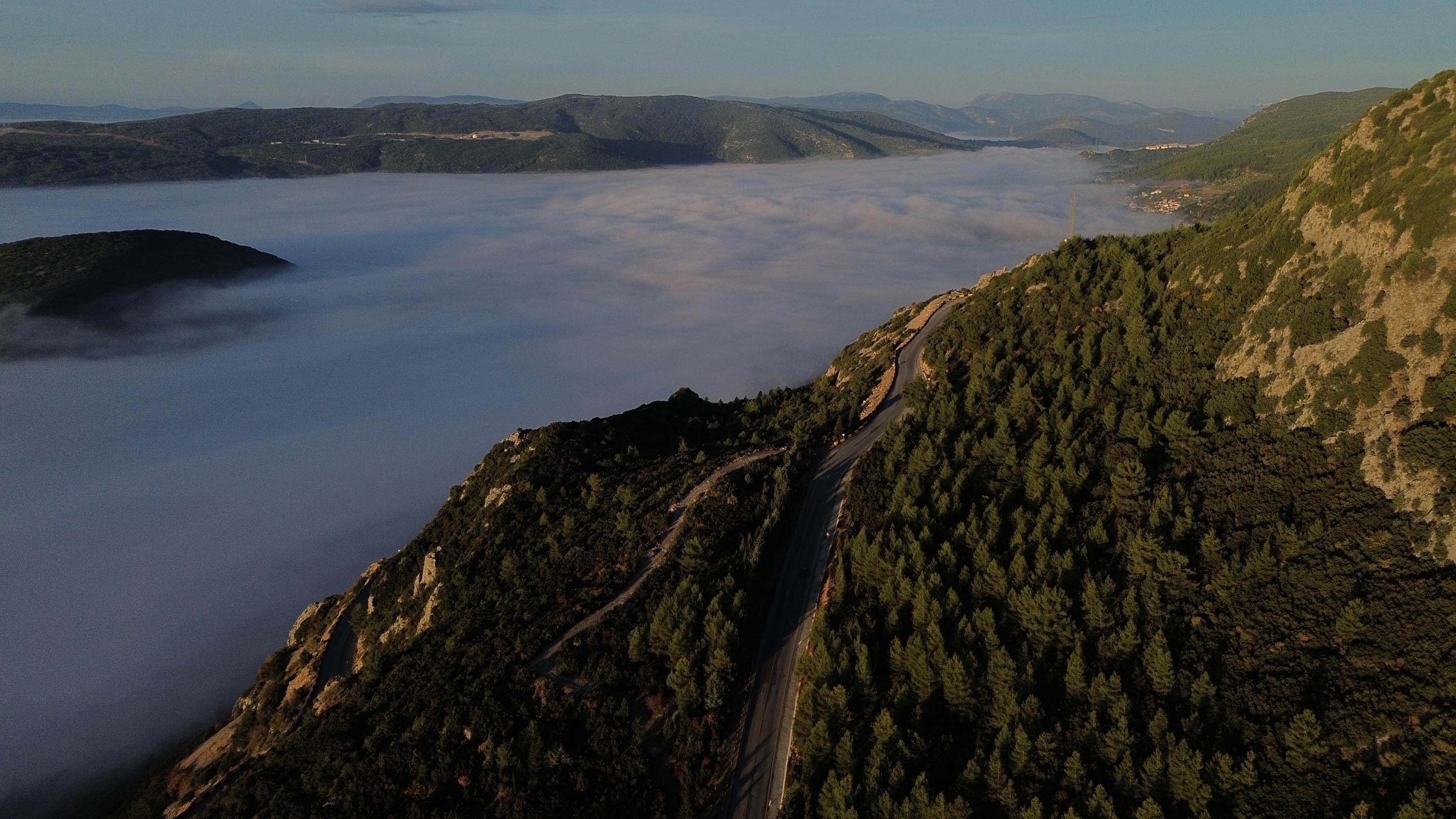 Tepelerden bakıldığında evlerin, ağaçların ve yolların sisin arasından belirdiği manzara izleyenleri büyüledi. Sisin dağların ve vadilerin arasında oluşturduğu bulut denizine benzer manzara dronla havadan görüntülendi. (DHA)