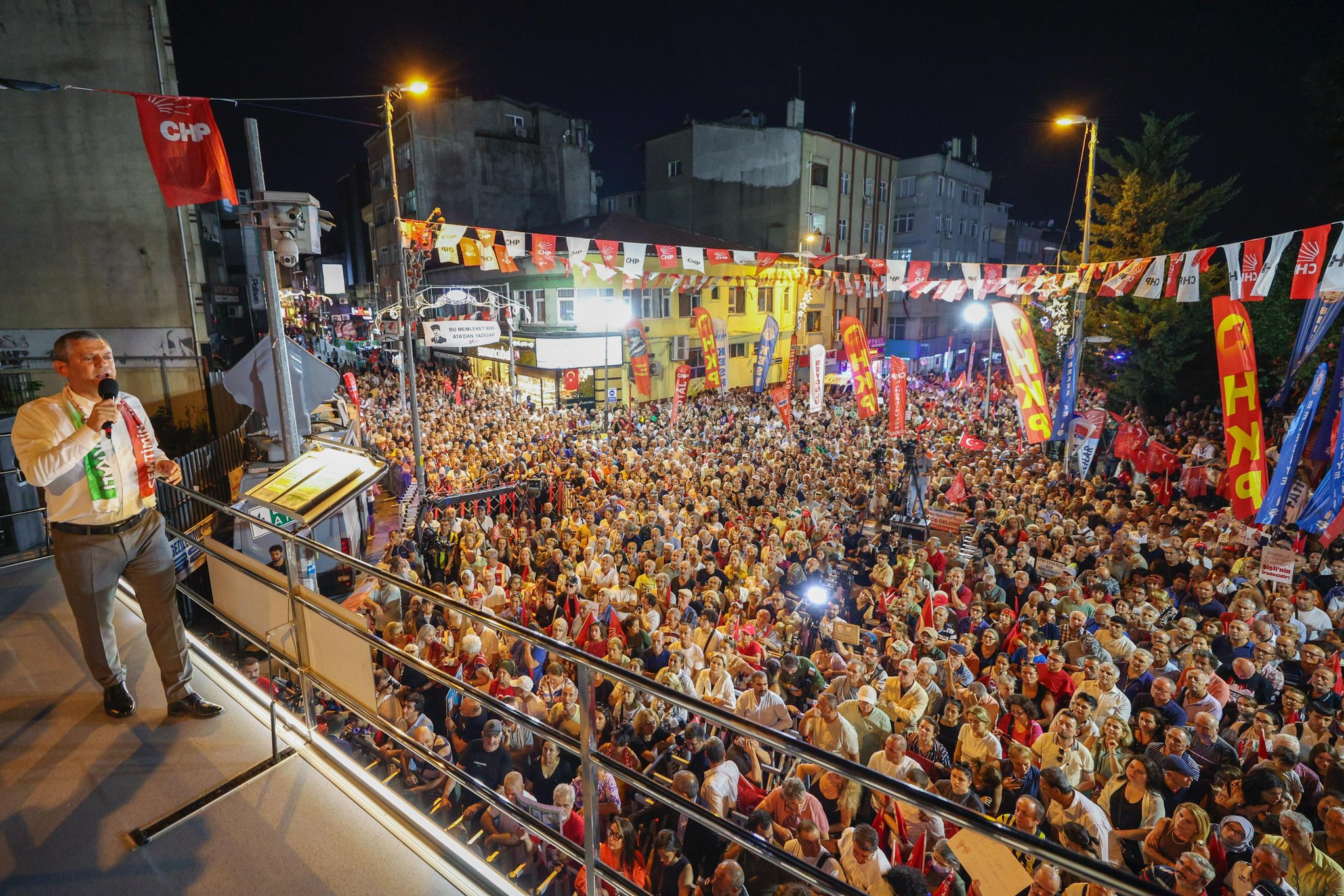 İBB Başkanı Ekrem İmamoğlu'nun tutuklanmasının ardından İstanbul'da süren mitinglerin bu haftaki adresi Bayrampaşa oldu. Sıcak havaya rağmen Yahya Kemal Parkı önünde gerçekleşen mitinge on binlerce vatandaş katıldı. CHP Genel Başkanı Özgür Özel, kalabalığa seslendi. Özel, "Adalet Bakanı, ben bugün konuşurken kızıp 'Lan' demişim, bana soruşturma açmış. Adalet Bakanı yarın 12.00'yi bekle. AK Parti, kuruluş yıl dönümü hediyen geliyor. Tayyip Bey, 'Turbun büyüğü heybede' diyon ya, heybede tutmayacağım, yarın 12.00'yi bekle. Yarın 12.00'de CHP Genel Merkezi'ne bütün basın mensuplarını çağırıyorum, imzalı, yazılı, açık açık isimler yazıyor. AK Toroslar çetesi çöküyor, AKP Parti çöküyor. Yarın AK Parti'ye kuruluş yıldönümü hediyesi. Siz hani bizden belediye başkanı çalacaksınız ya, yarın göreceğiz bakalım yüzünüz kaça çalacak. Bugün beni tehdit edenler, yarın göreceğiz AK tarafı da kara tarafı da." dedi.