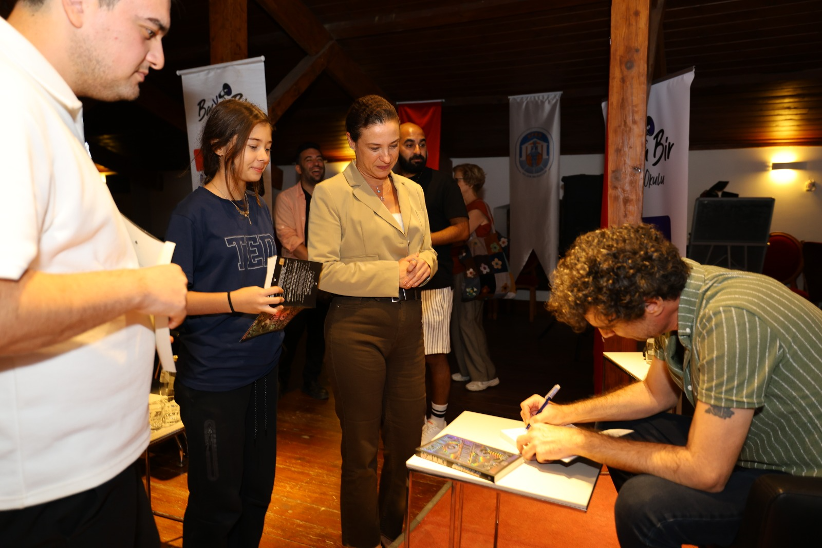 Söyleşinin sonunda Yazar Özgür Mumcu “Dünyalılar” adlı kitabını okurları için imzaladı.