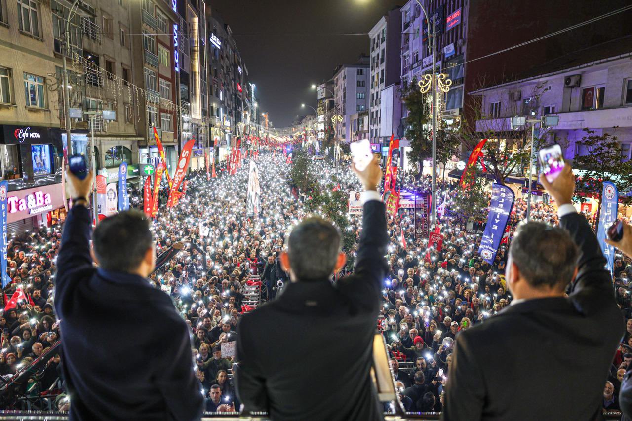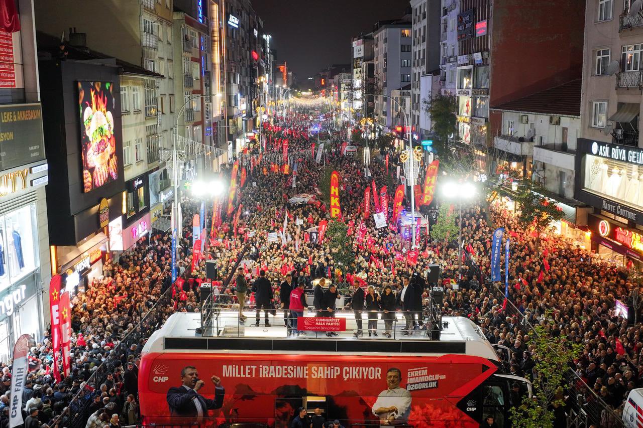 “Tayyip Erdoğan artık yenilmişti. Tayyip Erdoğan’ı yenen biri vardı. Ama artık Türkiye’nin yeni bir yenilmezi vardı. Önce kendi ilçesinde bir kez, ardından 2019’da iki kez, ardından bu seçimlerde bir daha; dört sefer Erdoğan’ı yenen ve asla yenilmeyen Ekrem İmamoğlu vardı. 19 Mart günü Ekrem İmamoğlu’nu gireceği ön seçime dört gün kala, dört gün gözaltında tuttan, sonra tam ön seçim günü hapse atan iktidar şunu hesap edemedi: O gün, 23 Nisan günü 15,5 milyon kişi, biri elinde iki bastonuyla iki büklüm, 90 yaşında; biri evladının koluna girmiş; 104 yaşında; biri karnındaki üç aylık hamile olduğu bebeğiyle o bebeğinin geleceği için adayını seçmeye ve belirlemeye gitmişti. İşte 23 Mart’ta 15,5 milyon kişinin aday gösterdiği, sizin üç kez üst üste İstanbul’a seçtiğiniz Ekrem Başkanımız bundan sonra ne yaparlarsa yapsınlar, her türlü haksızlığa karşı mücadelesini sürdürüyor. Eninde sonunda onu Cumhurbaşkanı yapacağız. ‘Cumhurbaşkanı İmamoğlu.’”