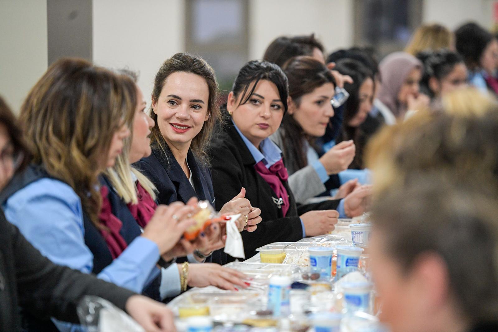 İzmir Büyükşehir Belediye Başkanı Dr. Cemil Tugay’ın eşi Öznur Tugay, ESHOT'ta görev yapan kadın şoför ve kadın hareket amirler ve İzmir İtfaiyesi'ndeki kadın personelle bir araya geldi. Türkiye'de en fazla kadın şoföre sahip olan Eshot Genel Müdürlüğü'nün Buca Gediz Atölyesi’nde iftar sofrasına konuk olan Öznur Tugay'a, İzmir Büyükşehir Belediyesi Genel Sekreter Yardımcısı ve ESHOT Genel Müdürü Övünç Özgen, İzmir Büyükşehir Belediyesi Genel Sekreter Yardımcısı Prof. Dr. Pınar Okyay, Eşrefpaşa Hastanesi Başhekimi Doç. Dr. Başak Bayram, İzmir Büyükşehir Belediyesi Sosyal Hizmetler Dairesi Başkanı Ela Hızlı, ESHOT’un kadın bürokratları da eşlik etti. Öznur Tugay, masaları dolaşarak kadın şoförlerle sohbet etti.