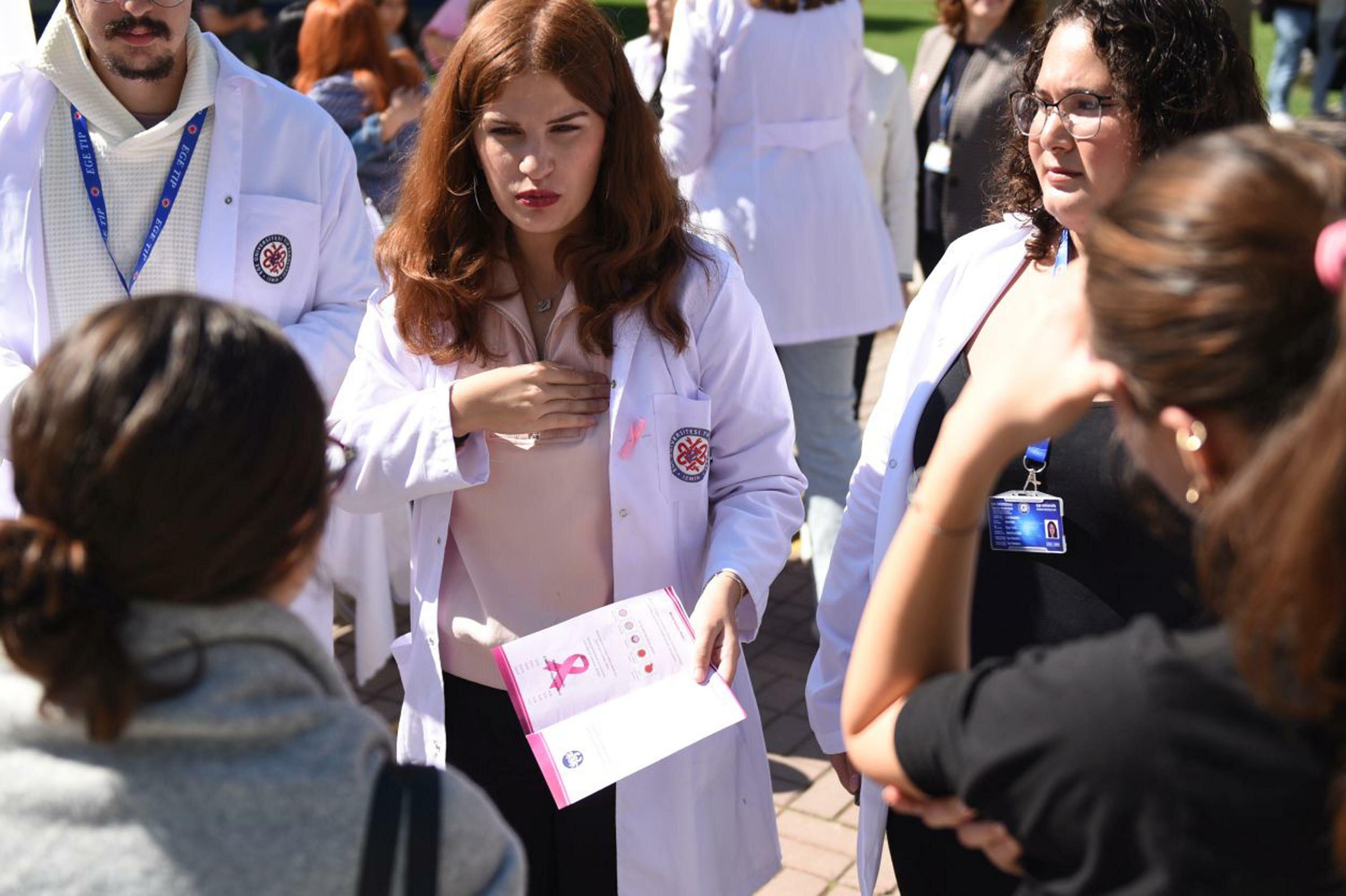 Öğrenciler, katılımcılara kendi kendine meme muayenesi ve düzenli doktor kontrollerinin önemine dair mesajlar verdi. Etkinlikle ilgili bilgi veren Prof. Dr. Emine Serra Kamer, "Meme kanseri, dünya genelinde ve ülkemizde kadınlar arasında en sık görülen tümörlerden biridir. Farkındalık ve erken tanı giderek önem kazanıyor. Her ay yalnızca beş dakika ayırarak memelerdeki şişlik, renk değişikliği, meme başında içe dönme veya kanlı akıntı gibi belirtiler fark edilebilir. Düzenli mamografi ve ultrasonografi ile de belirti vermeden kanser tespiti mümkün. Meme kanserinden korkmamak ve geç kalmamak gerekiyor. Erken teşhis hayat kurtarır. Tarama programlarına katılım, riskinizi minimize eder. Unutmayın, ayıracağınız beş dakika hayatınızı kurtarabilir" dedi.