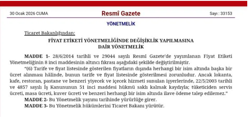 Resmi Gazete’de yayımlanan yeni düzenleme ile restoranlarda alınan servis ücreti, kuver ve benzeri ek bedeller uygulamadan kaldırıldı.