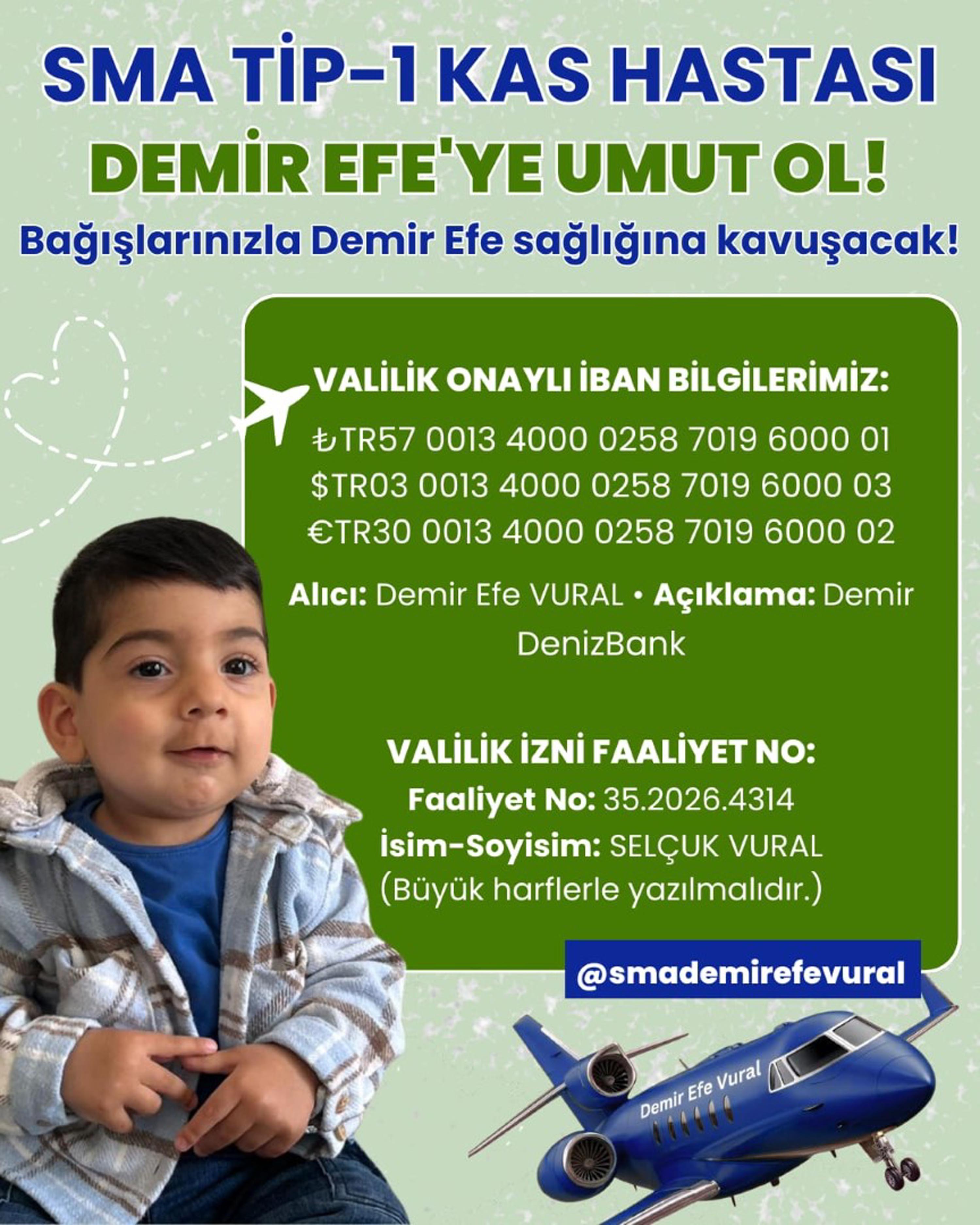 Menemen’de özel güvenlik görevlisi Selçuk Vural (33) ve ev kadını Leyla Vural'ın Avestar (9) ve Derin Ayda'dan (5) sonra dünyaya gelen oğulları Demir Efe'ye topuğundan alınan kanla SMA Tip 1 teşhisi konuldu. Süreci anlatan Selçuk Vural, "Topuk kanı alındıktan 10 gün sonra acı haberi aldık. Çevremizde görüyorduk ama insanın başına gelince dünyası başına yıkılıyormuş. Eşimle taşıyıcı olduğumuzu öğrendik. Şu ana kadar 5 doz Spinraza tedavisi aldık; fizik tedavilerle oğlumuzu hayatta tutmaya çalışıyoruz" dedi. 15 gün önce açılan Valilik onaylı bağış kampanyasının yüzde 1 seviyesinde olduğunu belirten Vural, "Demir Efe için 3 gün özel hastane, 2 gün eğitim kurumunda fizik tedaviye gidiyoruz. Fizyoterapistler eşliğinde herhangi bir belirti göstermemesi için çaba harcıyoruz. Sesimizi duyurmaya çalışıyoruz. Yeni kampanyayız. Tüm insanlardan destek bekliyoruz. Sesimiz olmalarını diliyoruz. Bu sadece bizim çocuğumuz değil, tüm Türkiye'nin çocuğu. Bize destek çıkmalarını bekliyoruz" diye konuştu.