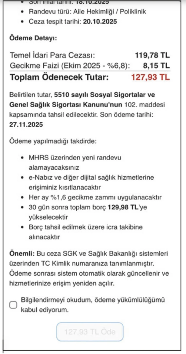 “Bakanlığımızın randevu sistemi olan Merkezi Hekim Randevu Sistemi (MHRS) üzerinden randevu almak, iptal etmek veya değiştirmek tamamen ücretsizdir. Vatandaşlarımızın mağduriyet yaşamamaları için işlemlerini yalnızca www.mhrs.gov.tr adresi ve MHRS mobil uygulaması üzerinden gerçekleştirmeleri önemle rica olunur. MHRS adıyla ücret talep eden sahte internet siteleri ve sosyal medya hesapları hakkında suç duyurusunda bulunulmuştur. Kamuoyunun bilgisine saygıyla duyurulur.”
