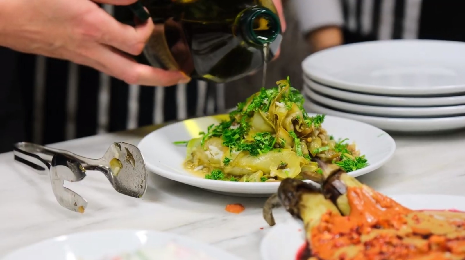 Şef Rıfat Yurttaş, İzmir Büyükşehir Belediyesi’nin pastacı çıraklığı kursundan mezun olan işitme engelli kursiyerlerle bir araya gelerek Ege mutfağına özgü meze ve zeytinyağlı yemekler yaptı. İşaret dili çevirmenleri aracılığıyla mezun kursiyerlerle iletişim kuran Yurttaş, yemek yapmanın inceliklerini aktardı.