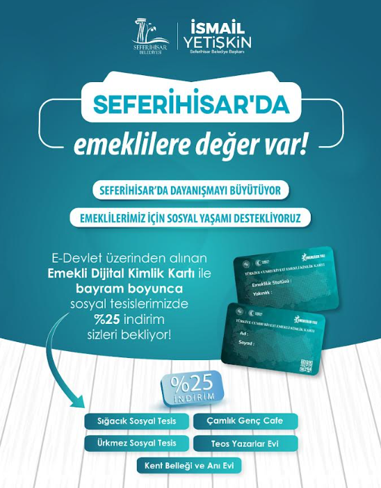 “Seferihisar’da emeklilere değer var” yaklaşımıyla başlatılan uygulama kapsamında, E-Devlet üzerinden alınan Emekli Kimlik Kartı’na sahip vatandaşlar, Ramazan Bayramı boyunca belediyeye ait sosyal tesislerde yüzde 25 indirimden yararlanabilecek.