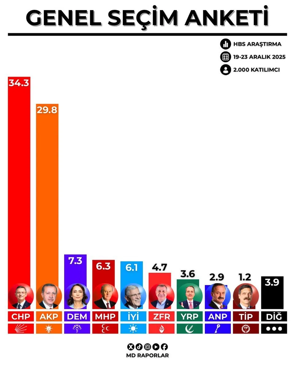 CHP Grup Başkanvekili Gökhan Günaydın, sosyal medya hesabı üzerinden Aralık ayına ait genel seçim anketi sonuçlarını kamuoyu ile paylaştı. HBS Araştırma Şirketi tarafından yapılan çalışmanın verilerini yayınlayan Günaydın, sonuçları değerlendirirken "kararsız seçmen" grubuna dikkat çekti ve partisinin yeni dönem stratejisine dair önemli mesajlar verdi.