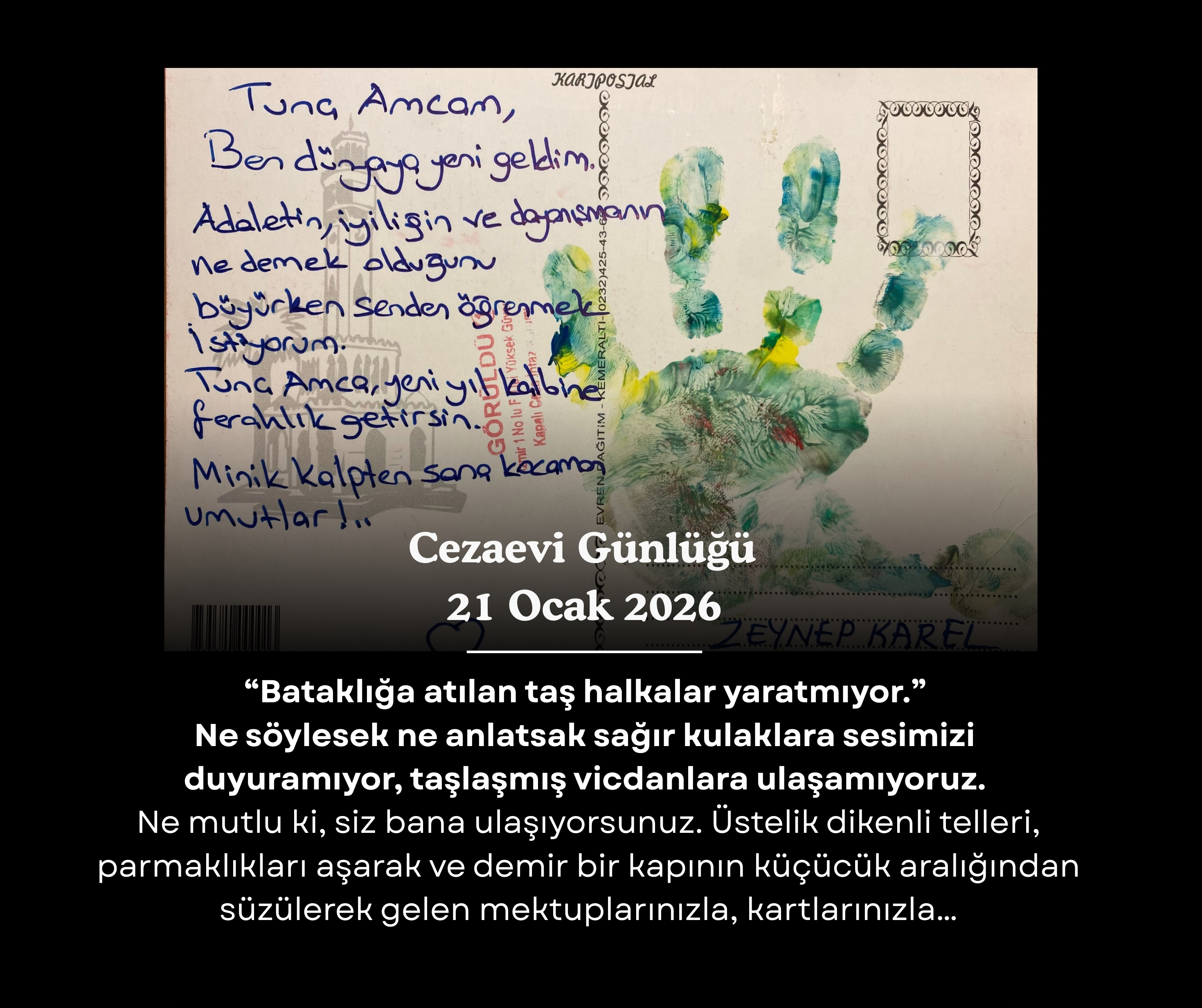Hiç merak etme, bugüne kadar bu hayattan öğrendiğim ne kadar erdem varsa son nefesime kadar anlatmaya, gereklerini yapmaya devam edeceğim. Tunç amcan, adaletin, iyiliğin ve dayanışmanın mumla arandığı bu karanlık bitsin ve ışıl ışıl aydınlık bir memlekette güle oynaya büyüyesin diye ne bedel ödemesi gerekirse ödeyecek. Gözlerinden öpüyor, minicik tertemiz kalbinin seni hep iyilik ve güzelliklerle buluşturmasını diliyorum.