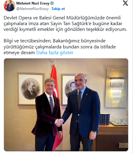 "Devlet Opera ve Balesi Genel Müdürlüğümüzde önemli çalışmalara imza atan Sayın Tan Sağtürk’e bugüne kadar verdiği kıymetli emekler için gönülden teşekkür ediyorum. Bilgi ve tecrübesinden, Bakanlığımız bünyesinde yürüttüğümüz çalışmalarda bundan sonra da istifade etmeye devam edeceğiz."