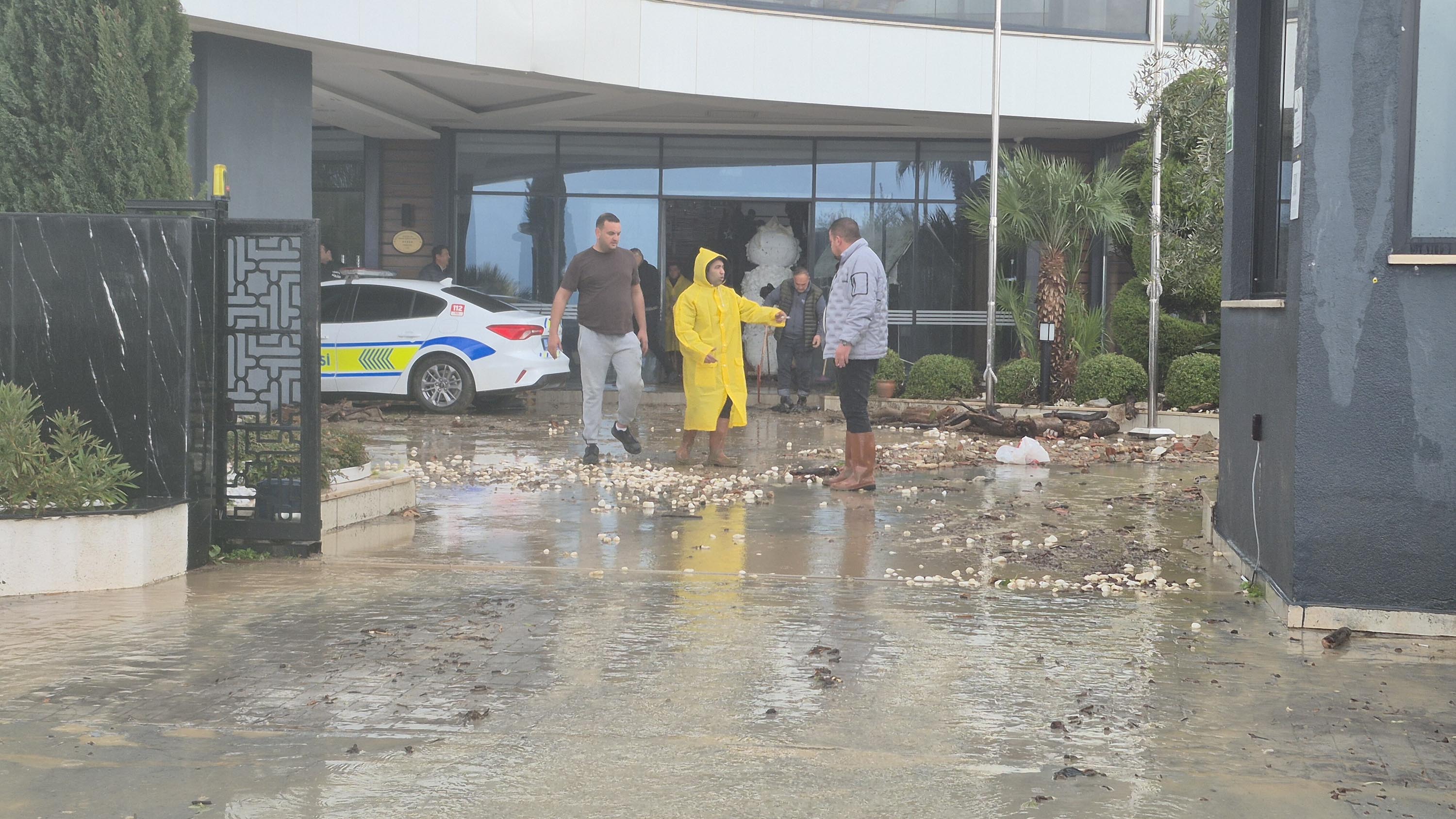 Aydın'da etkili olan sağanak yağışta Güzelçamlı Mahallesi'nde istinat duvarının yıkılması nedeniyle dere yatağından gelen sel sularının dolduğu 5 yıldızlı termal otelde konaklayan yaklaşık 600 müşteri, ekiplerce tahliye edildi.