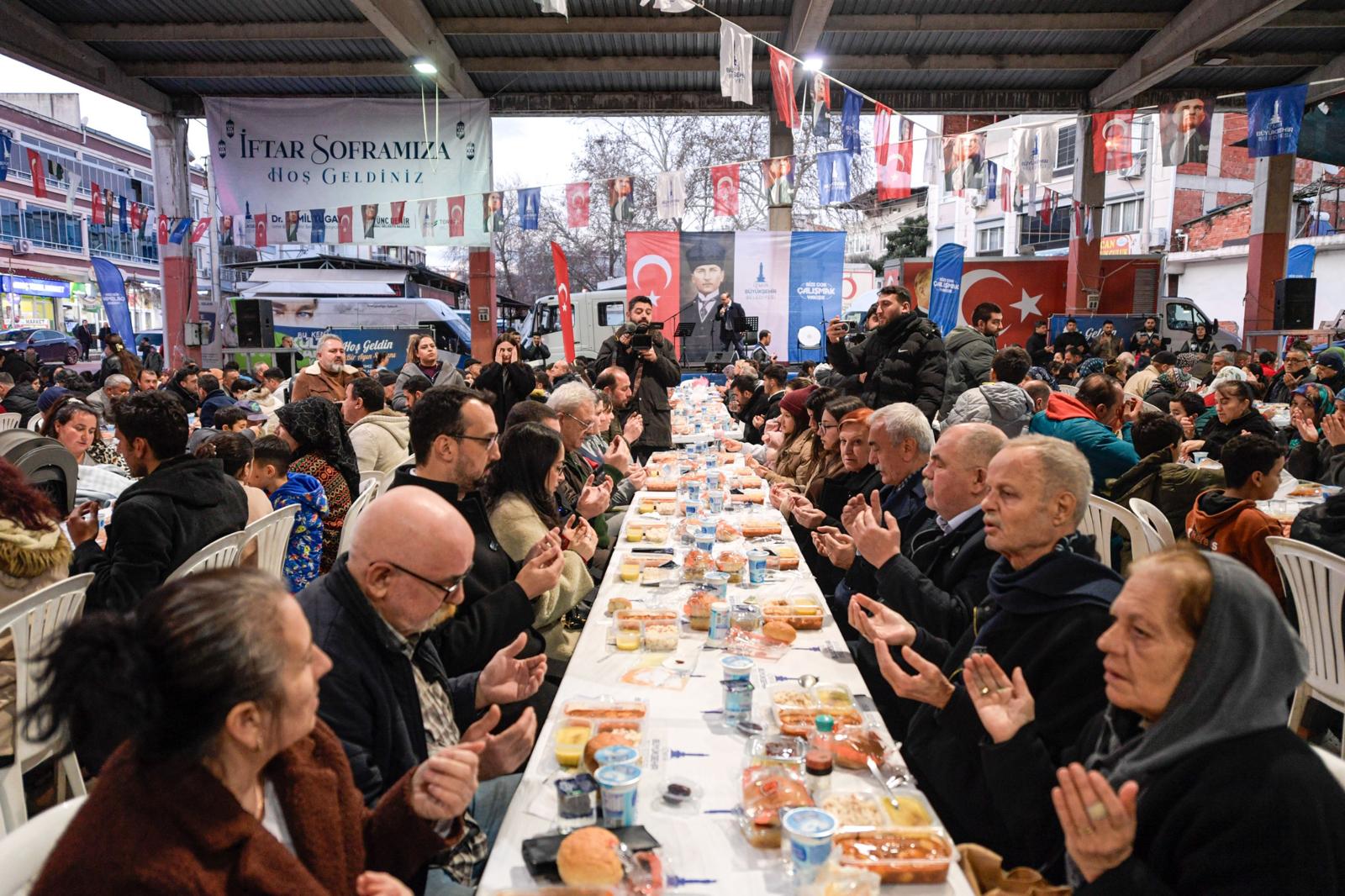 İzmir Büyükşehir Belediyesinin iftar sofrası 26 Şubat’ta Karşıyaka Volkan Vedat Akay Parkı’nda (Alaybey İZBAN yanı), 27 Şubat’ta Bornova Doğanlar Kapalı Pazaryeri’nde, 28 Şubat’ta Ödemiş Belediyesi Nikah ve Kongre Salonu’nda iftar sofraları kurulacak. Mart ayı programı ise 1 Mart’ta Çiğli Evka-2 Kapalı Pazaryeri’nde, 2 Mart’ta Balçova Teleferik Kapalı Pazaryeri ve Narlıdere Kapalı Pazaryeri’nde, 3 Mart’ta Güzelbahçe Belediye Düğün Salonu’nda sürecek. 4 Mart’ta Foça Yeni Foça Çok Amaçlı Spor Salonu’nda, 5 Mart’ta Kiraz Cem Yazan Kapalı Pazaryeri’nde, 6 Mart’ta Beydağ 2 Eylül Kurtuluş Parkı’nda, 7 Mart’ta Seferihisar Kapalı Pazaryeri’nde, 8 Mart’ta Menemen Cumhuriyet Meydanı’nda, 9 Mart’ta Selçuk Açık Pazaryeri (Türkmen Pazar Alanı)’nda iftar verilecek. Program 10 Mart’ta Konak Kemeraltı Milli Kütüphane Caddesi’nde, 11 Mart’ta Kemalpaşa Rekreasyon Alanı’nda, 12 Mart’ta Kınık Cumhuriyet Meydanı’nda, 13 Mart’ta Dikili Atatürk Meydanı’nda, 14 Mart’ta Bergama Cumhuriyet Meydanı’nda, 15 Mart’ta Aliağa Demokrasi Meydanı’nda devam edecek. İftar sofraları 16 Mart’ta Karabağlar Vatan Kapalı Pazaryeri’nde, 17 Mart’ta Karaburun Mordoğan Merkez’de, 18 Mart’ta Çeşme Meydan’da ve 19 Mart’ta Urla Meydan’da kurulacak.