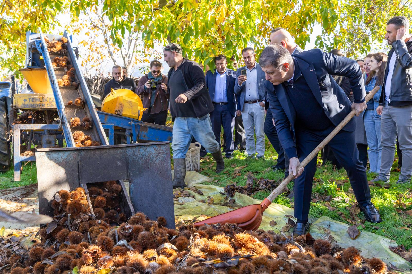 Küçük Menderes Havzası’nın zengin topraklarından yetişen, lezzetiyle ün yapan Beydağ kestanesinde hasat devam ediyor. Bölgenin kestane üreticileriyle buluşmak için Beydağ’a giden İzmir Büyükşehir Belediye Başkanı Dr. Cemil Tugay, Erikli Mahallesi’nde kestane hasatına katıldı. Başkan Dr. Cemil Tugay’a Beydağ Belediye Başkanı Şakir Başaran, İzmir Büyükşehir Belediyesi Genel Sekreter Yardımcısı Halit Çelik, belediye bürokratları, muhtarlar ve Beydağlı üreticiler eşlik etti. Erikli Mahallesi’ndeki köy meydanında geleneksel usullerle hazırlanan kestaneler fırınlara yerleştirildi. Başkan Tugay, program kapsamında zeytin hasadı yaptı ve yeni zeytin fidanlarını toprakla buluşturdu.